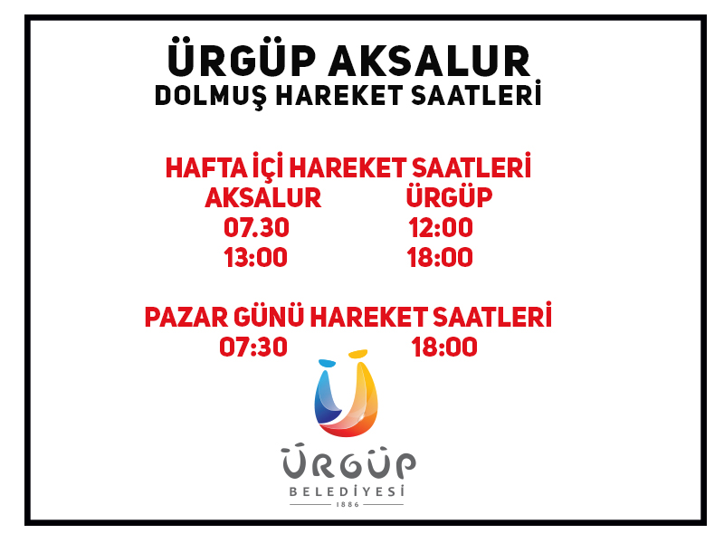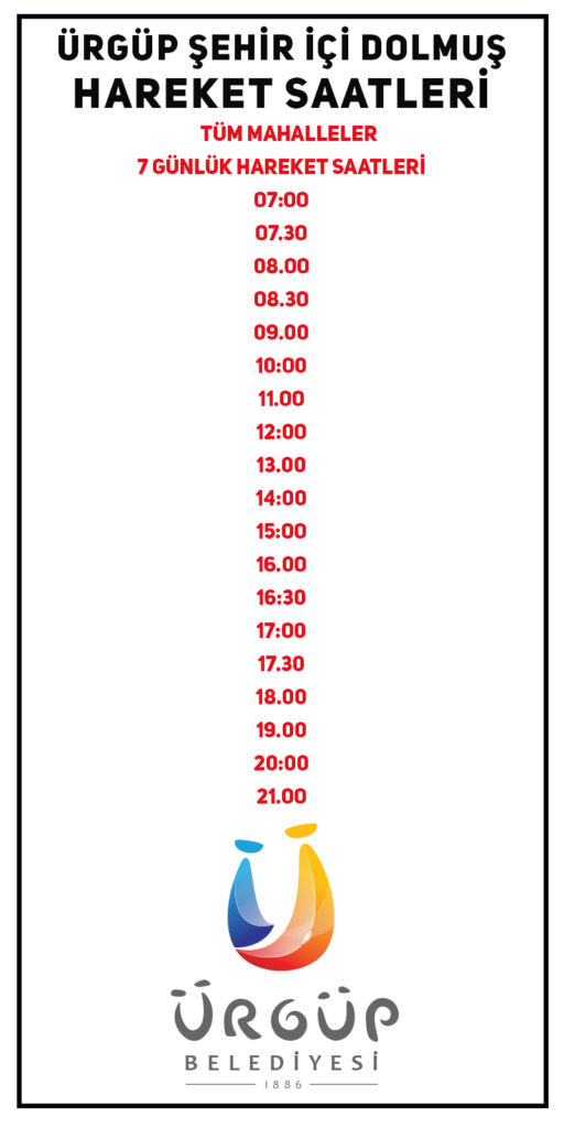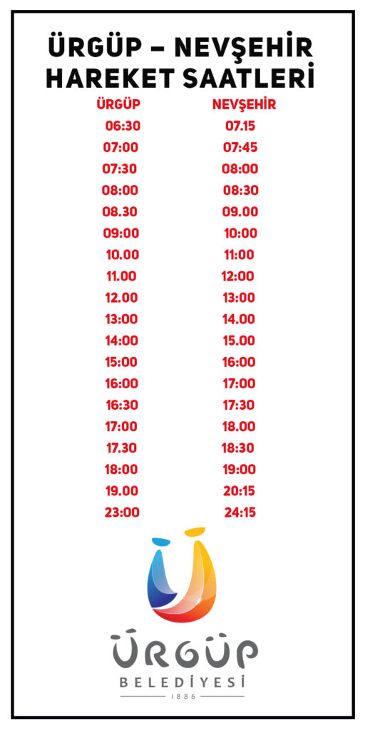 Ürgüp’ten hareket 06:30 ile 09:00 arası yarım saatte bir, 10:00 ile 16:00 arası saat başı, 16:00 ile 18:00 arası yarım saatte bir, 19:00 ile 23:00 son sefer olacak.