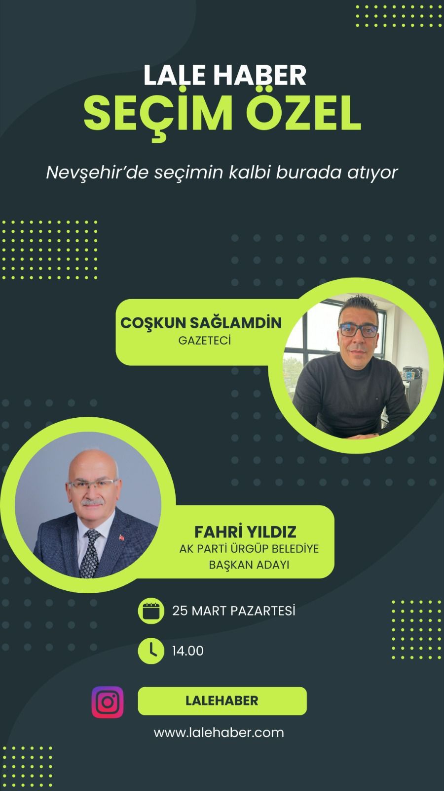 Ak Parti Ürgüp Belediye Başkan Adayı Fahri Yıldız, 25 Mart 2024 Pazartesi günü saat 14.00’de Gazeteci Coşkun Sağlamdin moderatörlüğünde Lale Haber İnstagram sosyal medya hesabından Yerel Seçim 2024 programına konuk olacak.