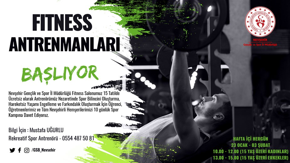 Nevşehir Gençlik ve Spor İl Müdürlüğünce Fitness Salonu 15 tatilde ücretsiz olarak Fitness Antrenörü nezaretinde spor bilincini oluşturma, hareketsiz yaşamı engelleme ve farkındalık oluşturmak için öğrenci, öğretmen ve tüm Nevşehirli halk 10 günlük spor kampına davet edildi.