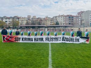 Nevşehir Damat İbrahim Paşa Ortaokulu Futbol Takımı, okul sporları müsabakalarında Filistin’e destek veren örnek bir davranış sergiledi. Takım, Filistin bayrağının renklerine yakın formalarıyla sahaya çıkarak Gazze’de yaşanan soykırıma dikkat çekti.