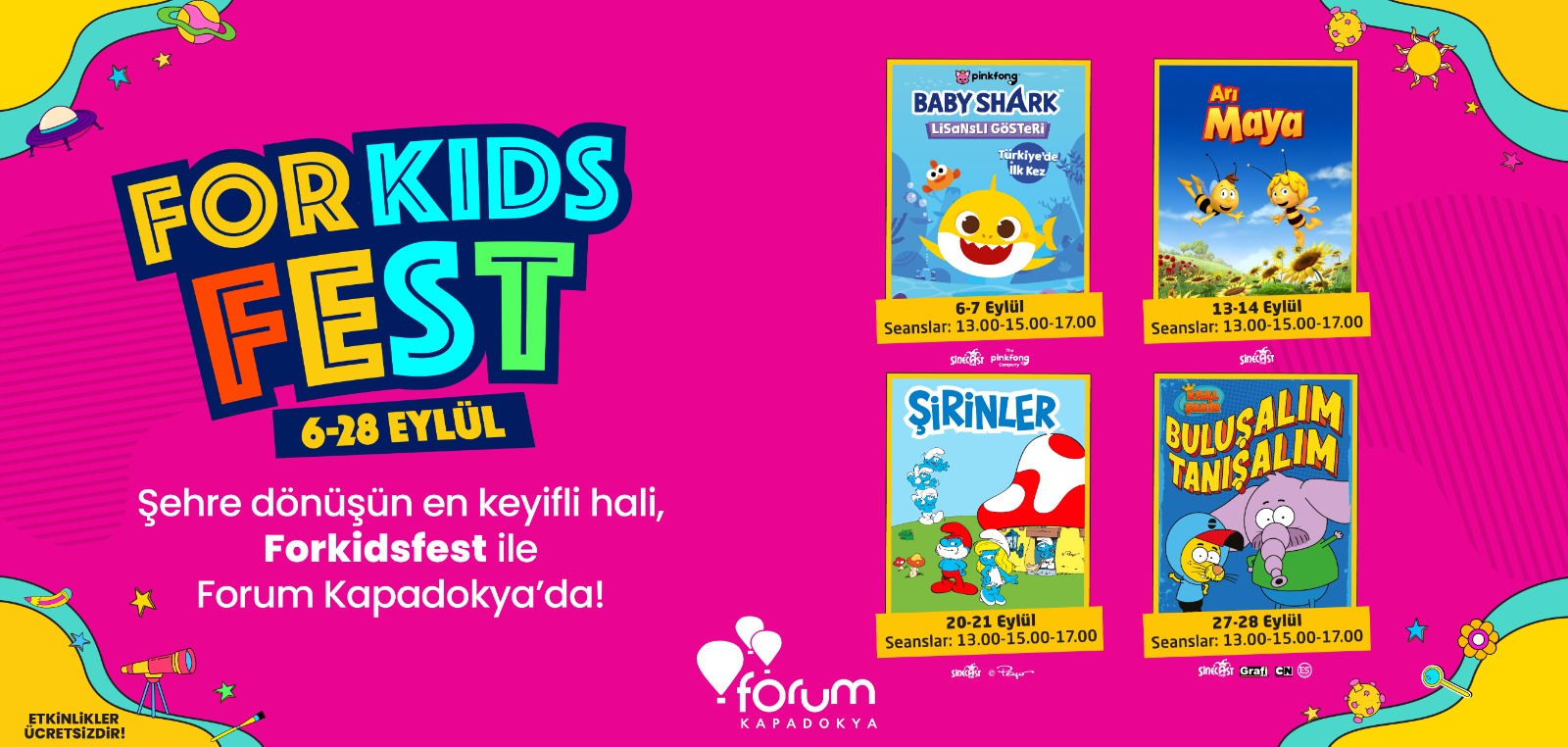 Renkli müzikal şovlar, eğitici içerikler ve interaktif etkinliklerle dolu ForKidsFest, okul döneminde de çocukların eğlenceye davet ediyor. Forum Kapadokya, “Şehre dönüşün en keyifli hali” anlayışıyla hayata geçirdiği bu özel festivalde miniklere sadece eğlence dolu anlar değil, aynı zamanda öğrenme ve keşfetme fırsatları da sunuyor.