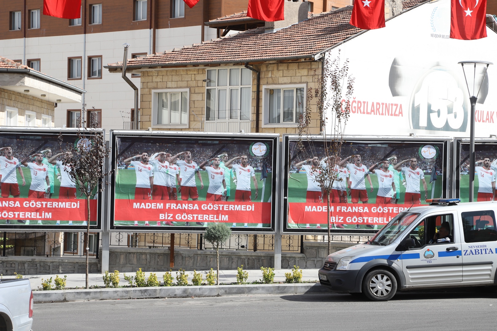 Türkiye’nin deplasmanda Fransa ile berabere kalarak gruptaki liderliğini sürdürdüğü karşılaşmada A Milli Takım oyuncularımız gol sevincinin yer aldığı fotoğraflar Nevşehir’in dört bir yanındaki billboardlarda sergileniyor.