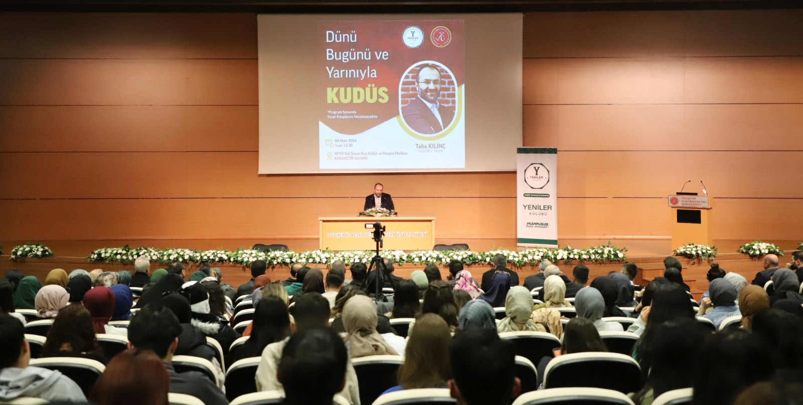 Nevşehir Hacı Bektaş Veli Üniversitesi (NEVÜ) Yeniler Kulübü ve TÜGVA Nevşehir iş birliğiyle, gazeteci-yazar Taha Kılınç’ın konuşmacı olduğu ‘Dünü, Bugünü ve Yarınıyla Kudüs’ konulu söyleşi düzenlendi.