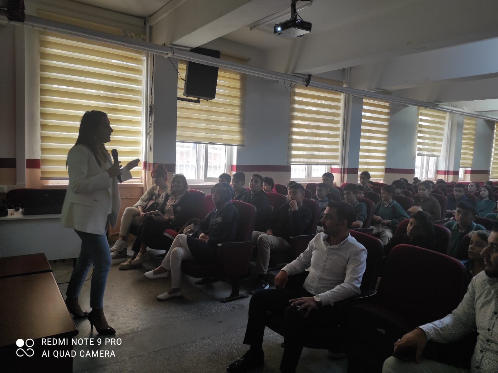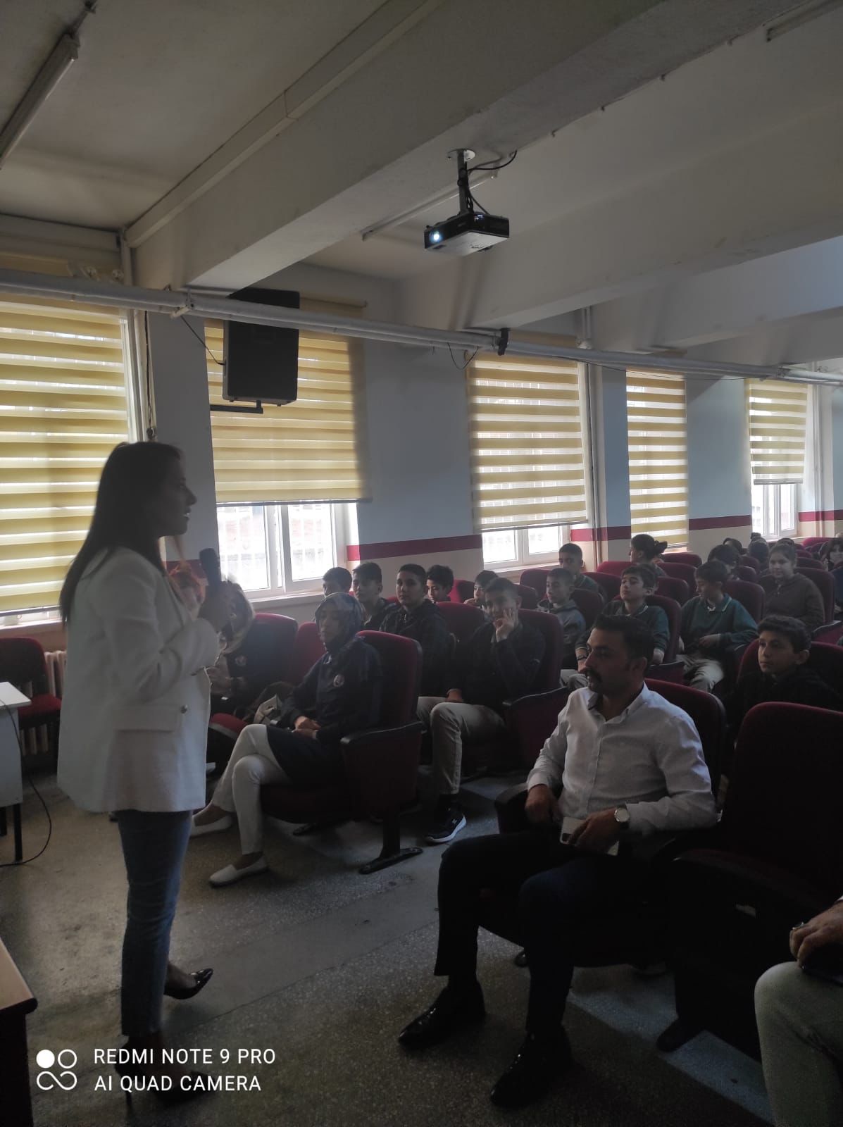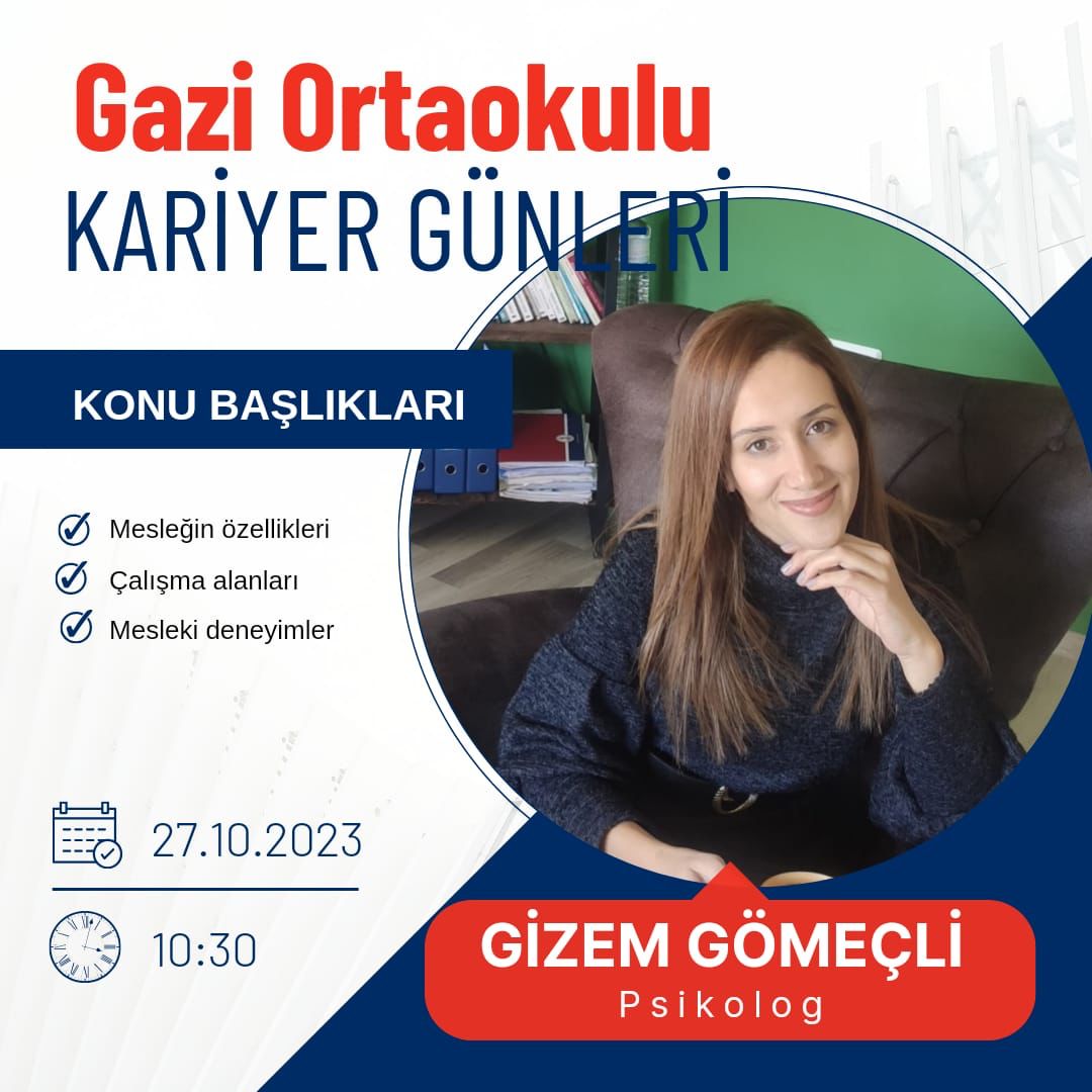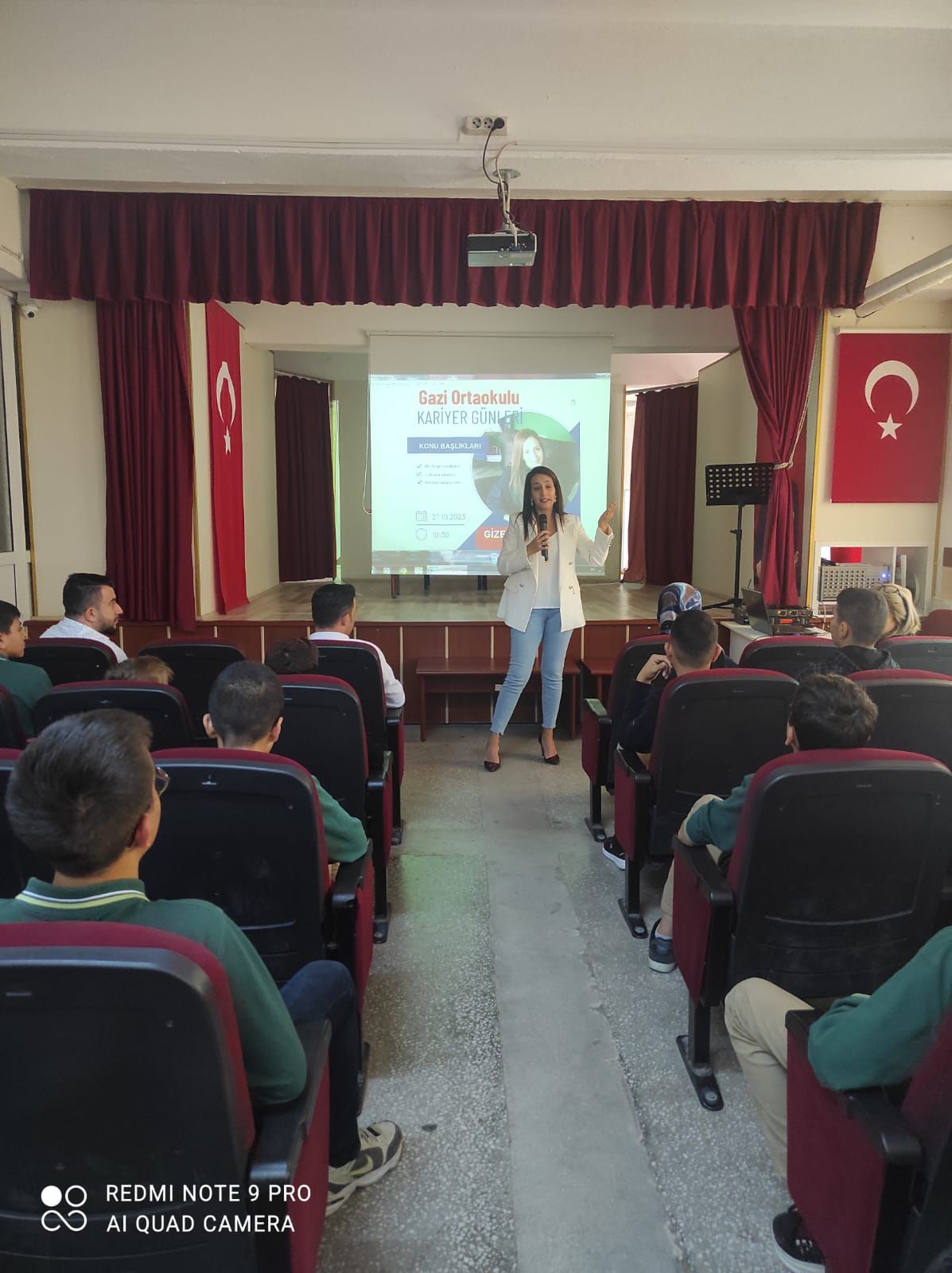 Gazi Ortaokulunda geçtiğimiz yıl başlatılan ve birbirinden değerli konukların ağırlandığı “Kariyer Günleri”programı hız kesmeden devam ediyor. Kariyer Günleri kapsamında çok sayıda meslek sahibi okulda öğrencilerle buluşturulurken, bugün de yine değerli Psikolog Gizem GÖMEÇLİ keyifli bir söyleşiyle öğrencilerle bir araya geldi. Psikolog Gizem GÖMEÇLİ,öğrencilere psikoloji bölümü hakkında bilgi verirken, psikolog olmanın keyifli yönlerine ve zorluklarına değinerek meslek hakkında öğrencileri bilgilendirdi. Psikologların çalışma şartları, mesleğin avantajları ve iş imkanlarının konuşulduğu söyleşide Psikolog Gizem GÖMEÇLİ kendi iş deneyimlerinden de bahsetti.İlgi çeken bu keyifli ve verimli söyleşi öğrencilerin sorularının cevaplanmasıyla sona erdi.