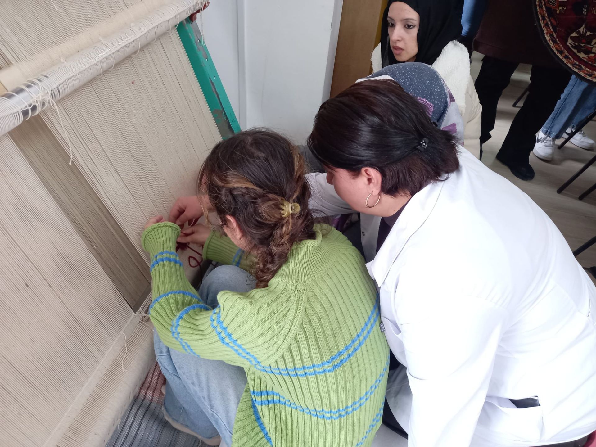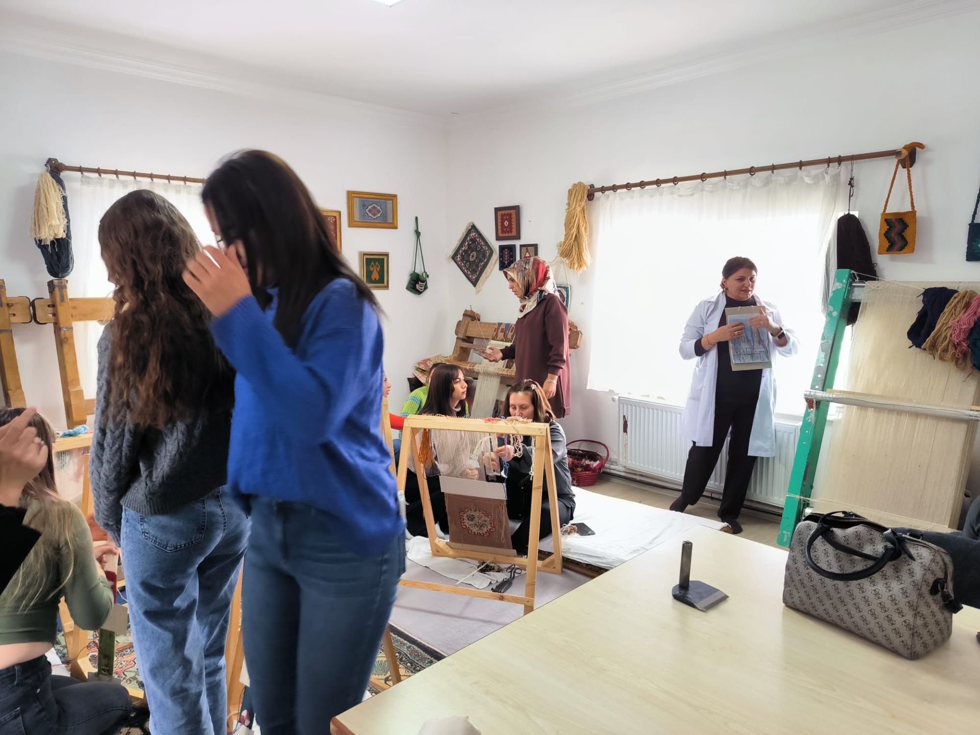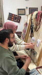 Teorik bilgilerin ardından uygulama aşamasına geçildi. Üniversite öğrencileri, geleneksel halı dokuma tezgâhlarının başına geçerek kursiyerlerle birlikte Türk düğümü (Gördes düğümü) tekniğini deneyimlediler. Renkli görüntülerin oluştuğu ziyarette, akademik eğitimin saha tecrübesiyle buluşması sağlandı.