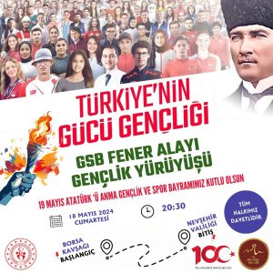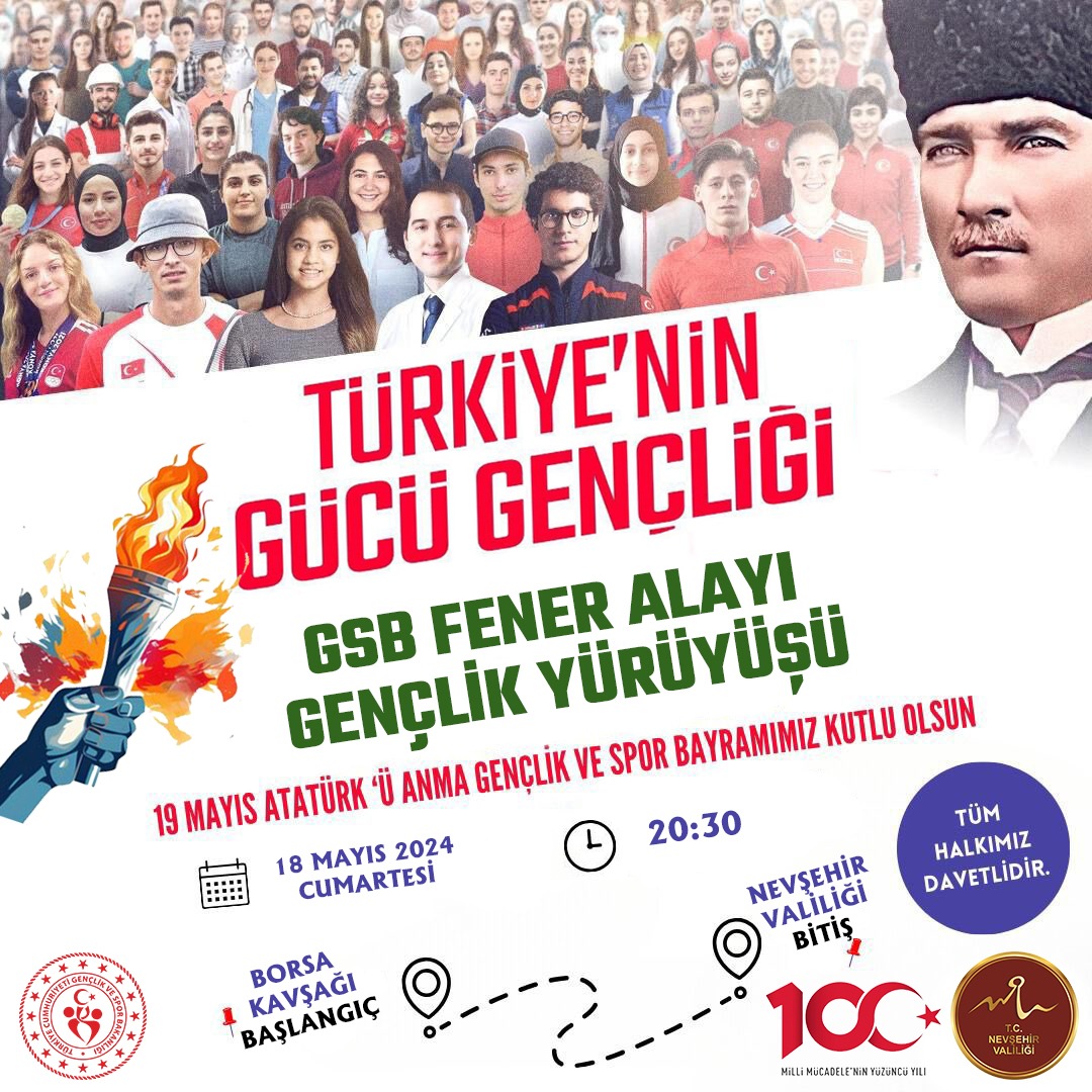 19 Mayıs Atatürk’ü Anma, Gençlik ve Spor Bayramı etkinlikleri kapsamında 18 Mayıs 2024 Cumartesi günü Saat 20.30’da Fener Alayı gençlik yürüyüşü düzenlenecek. 19 Mayıs Atatürk’ü Anma, Gençlik ve Spor Bayramı kutlama programında bulunan 18 Mayıs Cumartesi günü Saat 20.30’da Borsa Kavşağı önünden başlayacak Fener Alayı gençlik yürüyüşü Nevşehir Valiliği önünde son bulacak.