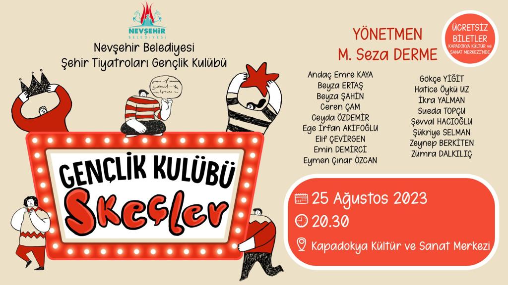 Nevşehir Belediyesi tarafından çocuklar ve gençler için düzenlenen Yaratıcı Drama ve Uygulamalı Tiyatro Kursu’na katılan çocuk ve gençler, 25 Ağustos 2023 Cuma akşamı Kapadokya Kültür ve Sanat Merkezi’nde ‘Gençlik Kulübü Skeçler’ adlı programda sahneye çıkacak.
