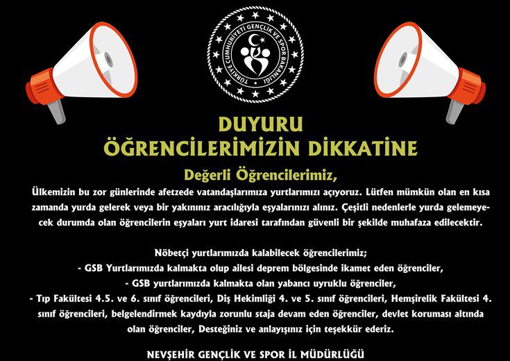 Nevşehir Gençlik ve Spor İl Müdürlüğü kredi yurtlar kurumuna bağlı yurtlarda barınan öğrencilere önemli bir hatırlatma da bulundu.