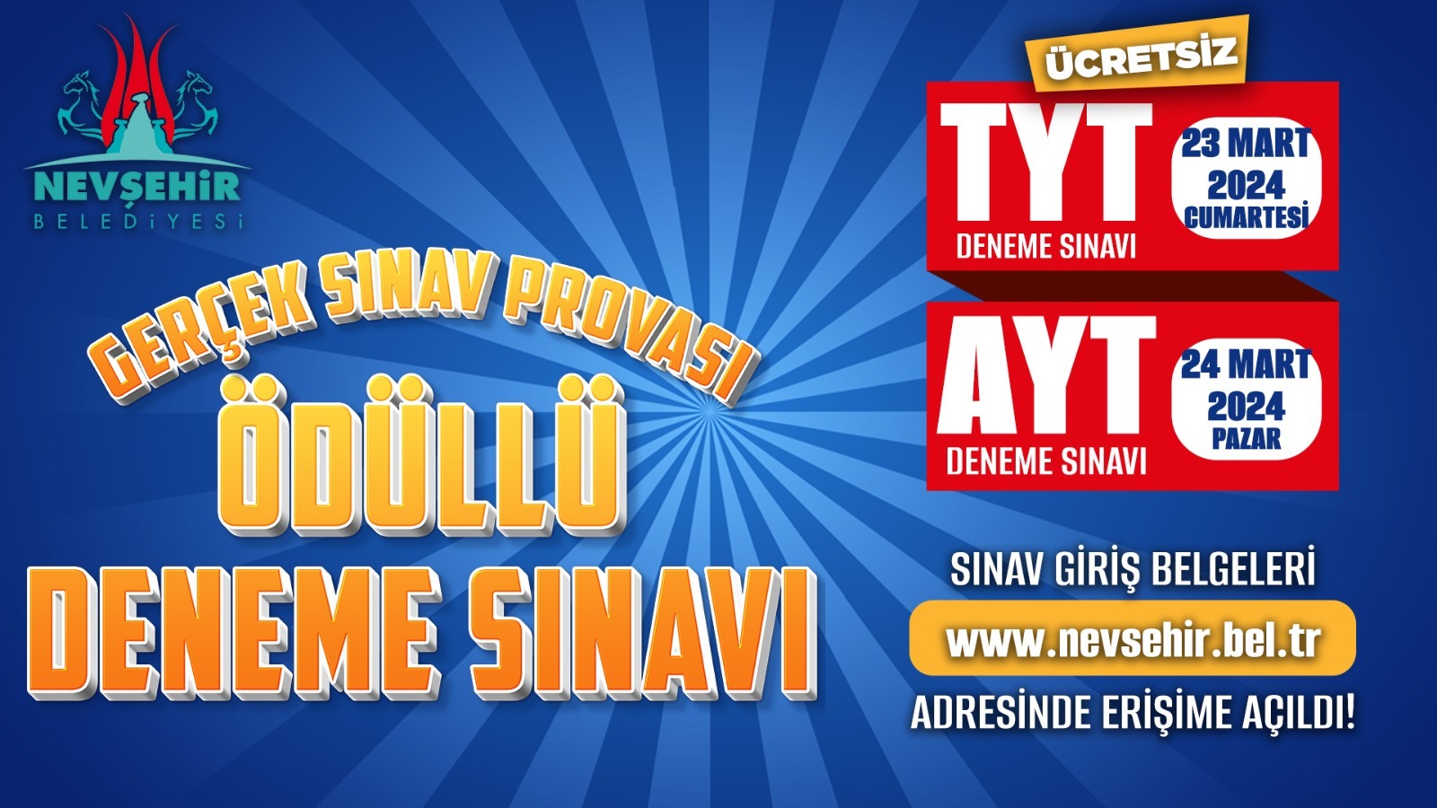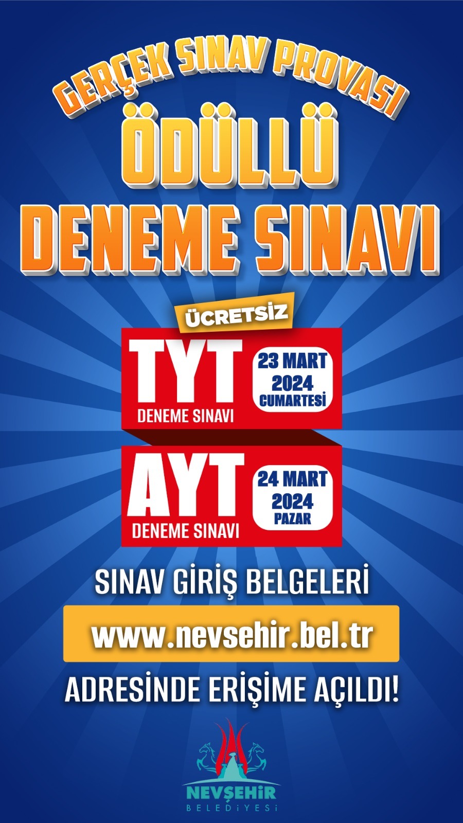 Nevşehir Belediyesi tarafından, TYT ve AYT sınavlarına hazırlanan öğrenciler için düzenlenen ödüllü deneme sınavına katılacak öğrenciler Sınav Giriş Belgeleri’ni www.nevsehir.bel.tr adresinden indirebilecek.