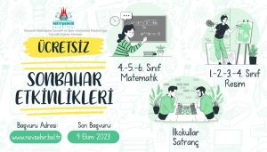 Nevşehir Belediyesi Gönüllü Eğitim Merkezi’nde 1, 2, 3, 4, 5 ve 6. sınıf öğrencilerine okul derslerine destek ve sosyal yönden kendilerini geliştirmeleri için Matematik, Resim, Satranç Kursları açılacak. Ücretsiz olarak açılacak kurslar için başvurular 9 Ekim tarihinde sona erecek. 14-15 Ekim 2023 tarihlerinde başlayacak ve sınırlı kontenjanlarla açılacak olan kurslar, 16-17 Aralık 2023 tarihinde tamamlanacak.