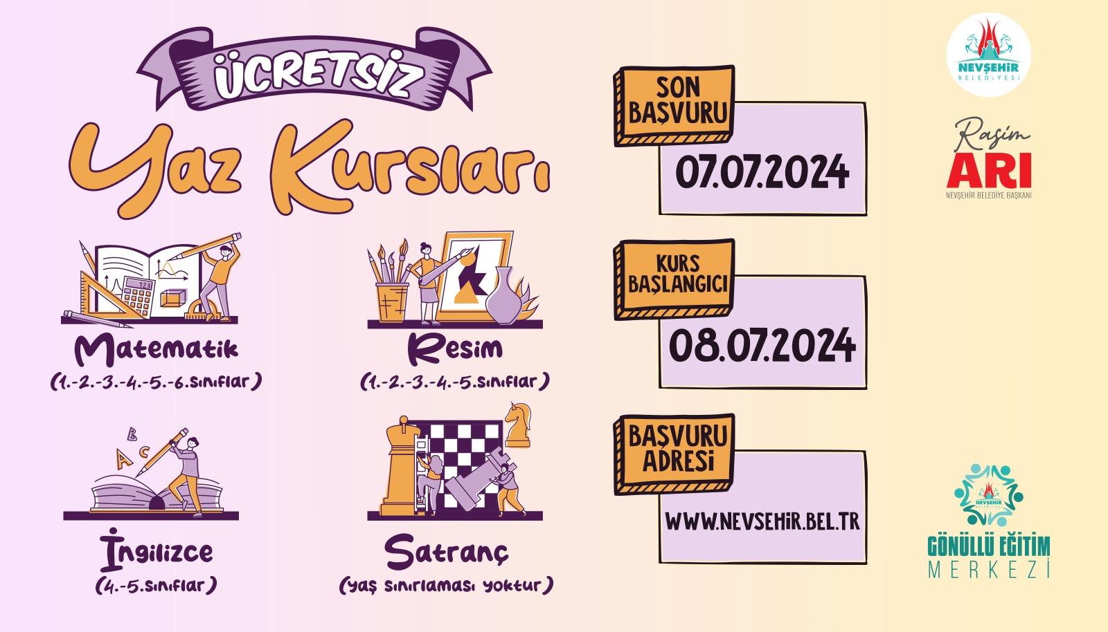 Nevşehir Belediyesi Gençlik ve Spor Hizmetleri Müdürlüğü bünyesinde faaliyetlerini sürdüren Gönüllü Eğitim Merkezi’nde, öğrenciler için 4 farklı branşta yaz dönemi kursları açılacak. Sınırlı kontenjanlarla açılacak olan Matematik kursuna 1, 2, 3, 4, 5 ve 6. Sınıf öğrencileri, İngilizce kursuna 4 ve 5. Sınıf öğrencileri, Resim kursuna 1, 2, 3, 4 ve 5. Sınıf öğrencileri ve Satranç kursuna ise dileyen tüm öğrenciler katılabilecek.