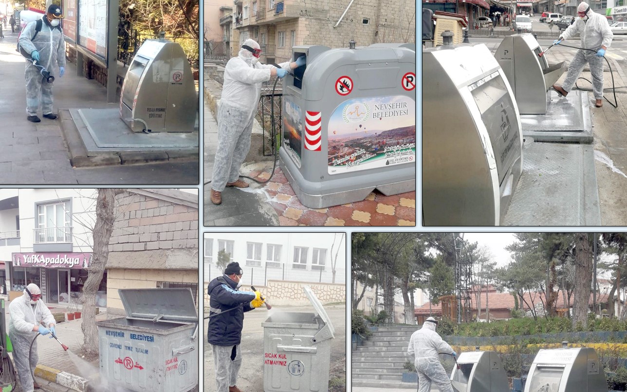 Göreme Belediyesi yeni tip Koronavirüs (covid-19) tedbirleri kapsamında başlattığı dezenfekte çalışmaları, çöp konteynerlerinin dezenfekte çalışması ile devam etti.