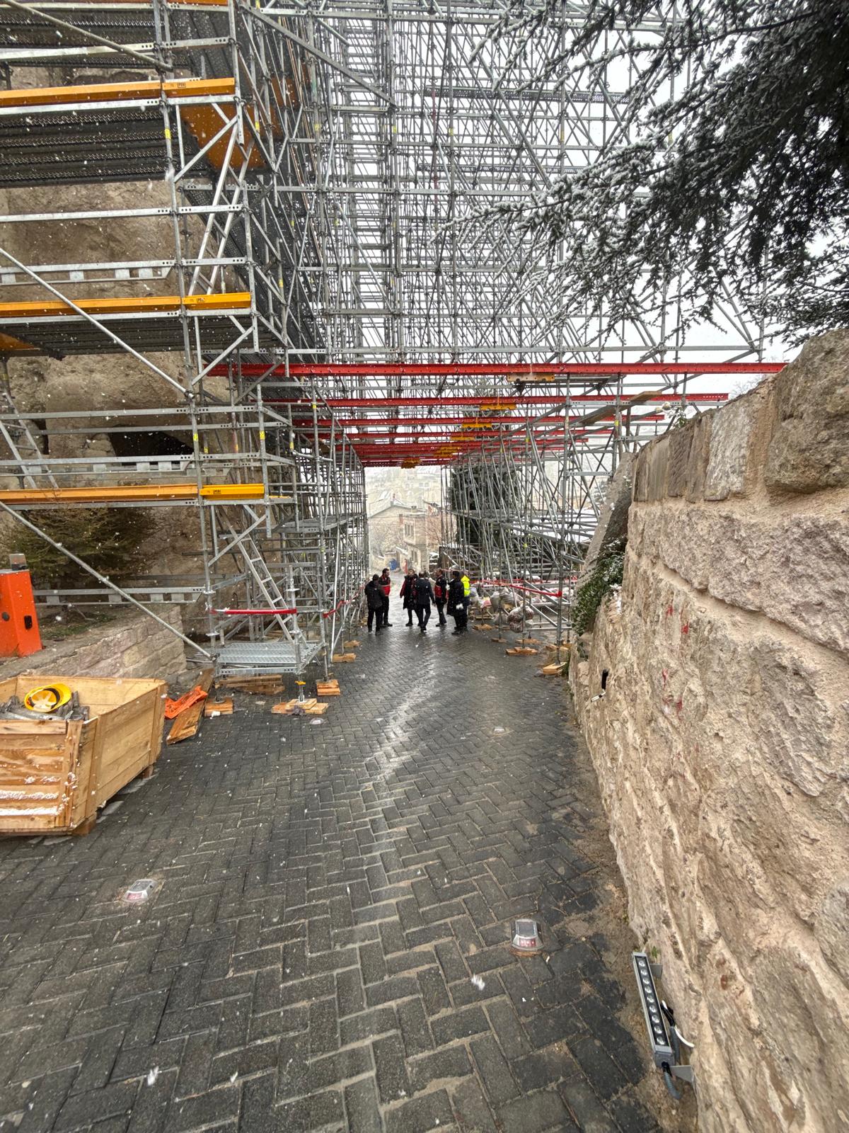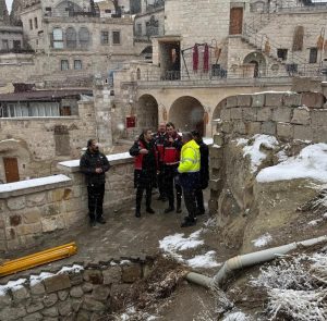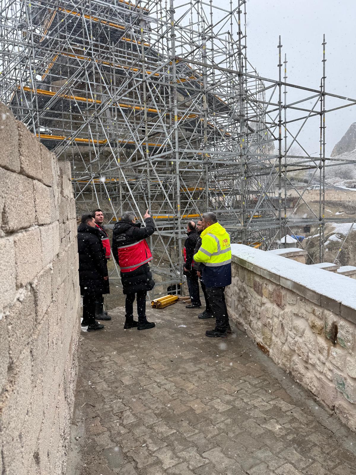 Kapadokya’da iklim krizine bağlı nedenlerle yıkılma tehlikesi bulunan Göreme’deki bir peribacasında güçlendirme ve restorasyon çalışmalarına, olumsuz hava koşullarına rağmen başlandı.