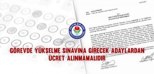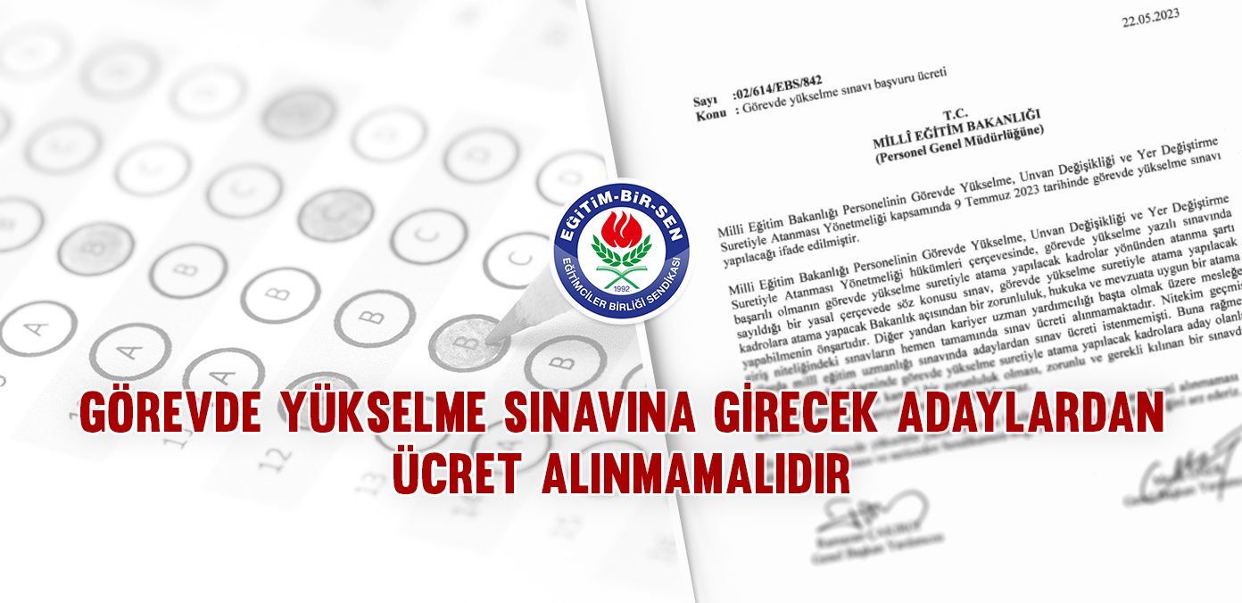 Eğitim-Bir-Sen Millî Eğitim Bakanlığına başvuruda bulunarak görevde yükselme yazılı sınavına katılacak adaylardan sınav ücreti alınmaması için düzenleme yapılmasını istedi.