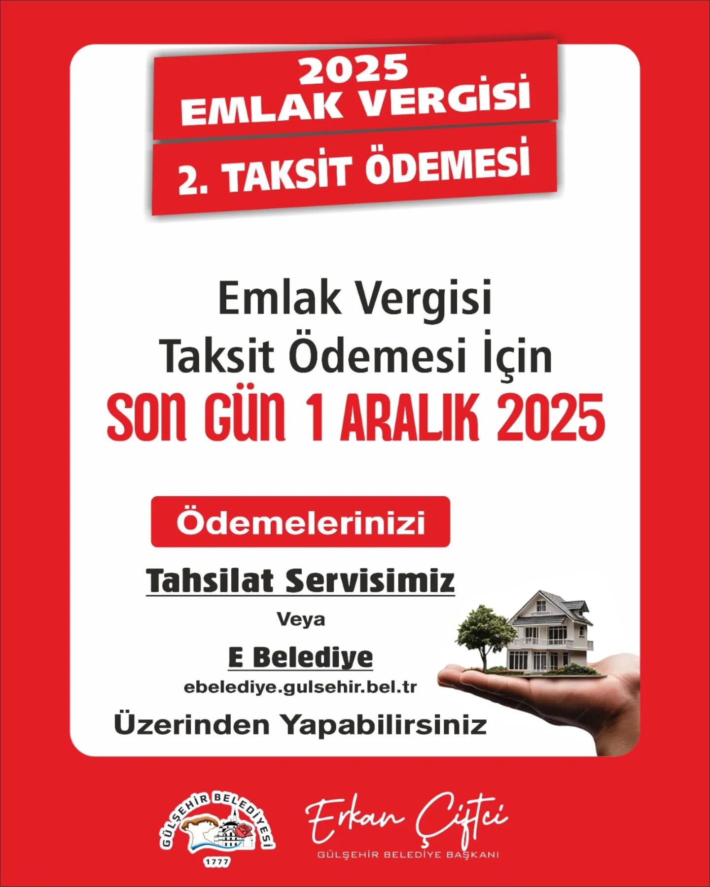 Gülşehir Belediyesi, emlak vergisi ödemelerinde son tarihin yaklaştığını duyurarak vatandaşlara uyarıda bulundu. Belediyeden yapılan açıklamada, emlak vergisi ikinci taksit ödemelerinin 1 Aralık 2025 tarihinde sona ereceği belirtildi.