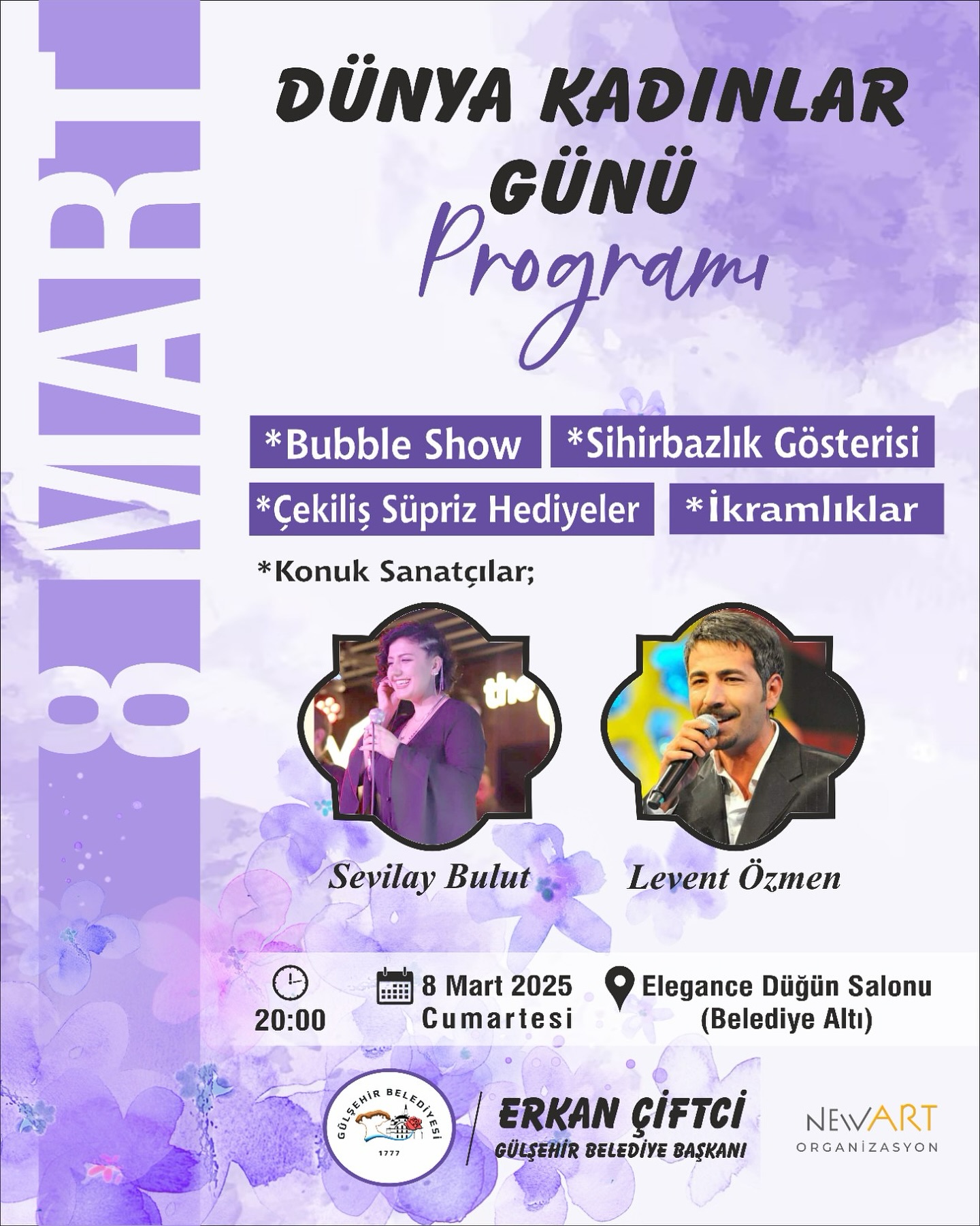 8 Mart Cumartesi akşamı saat 20:00’de Elegance Düğün Salonu ( Belediye Altında) gerçekleşecek etkinlik, renkli ve keyifli anlara sahne olacak. Gülşehir Belediye Belediye Başkanı Erkan Çiftci, tüm kadınları bu anlamlı günde davet ederek, birlikte eğlenmeye ve unutulmaz bir gece geçirmeye davet ediyor.