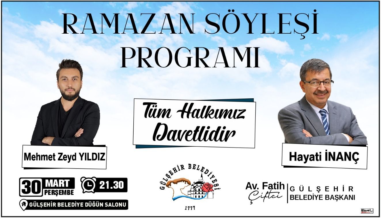 30 Mart Perşembe günü Saat 21.30, Gülşehir belediyesi düğün salonunda düzenlenecek olan ramazan söyleşisinin konuğu Hukukçu, eğitimci ve program yapımcısı Hayati İnanç olacak. Programı ulusal radyolarda programcılık yapan Mehmet Zeyd Yıldız sunacak.