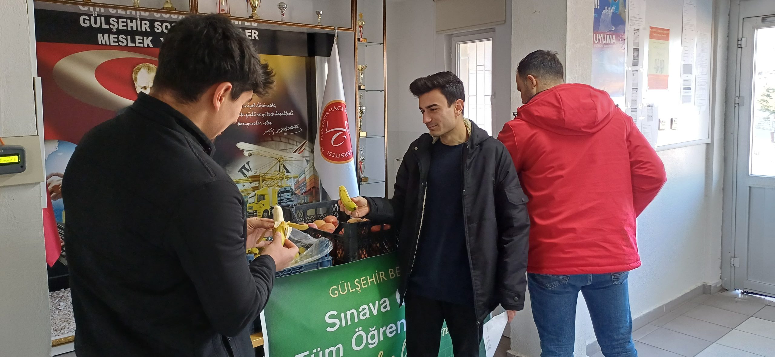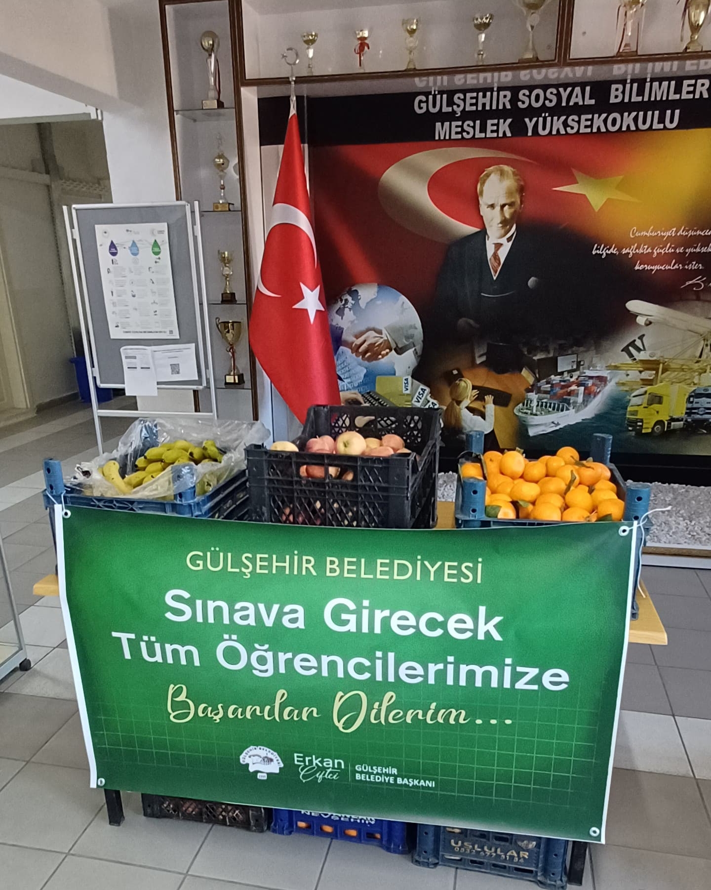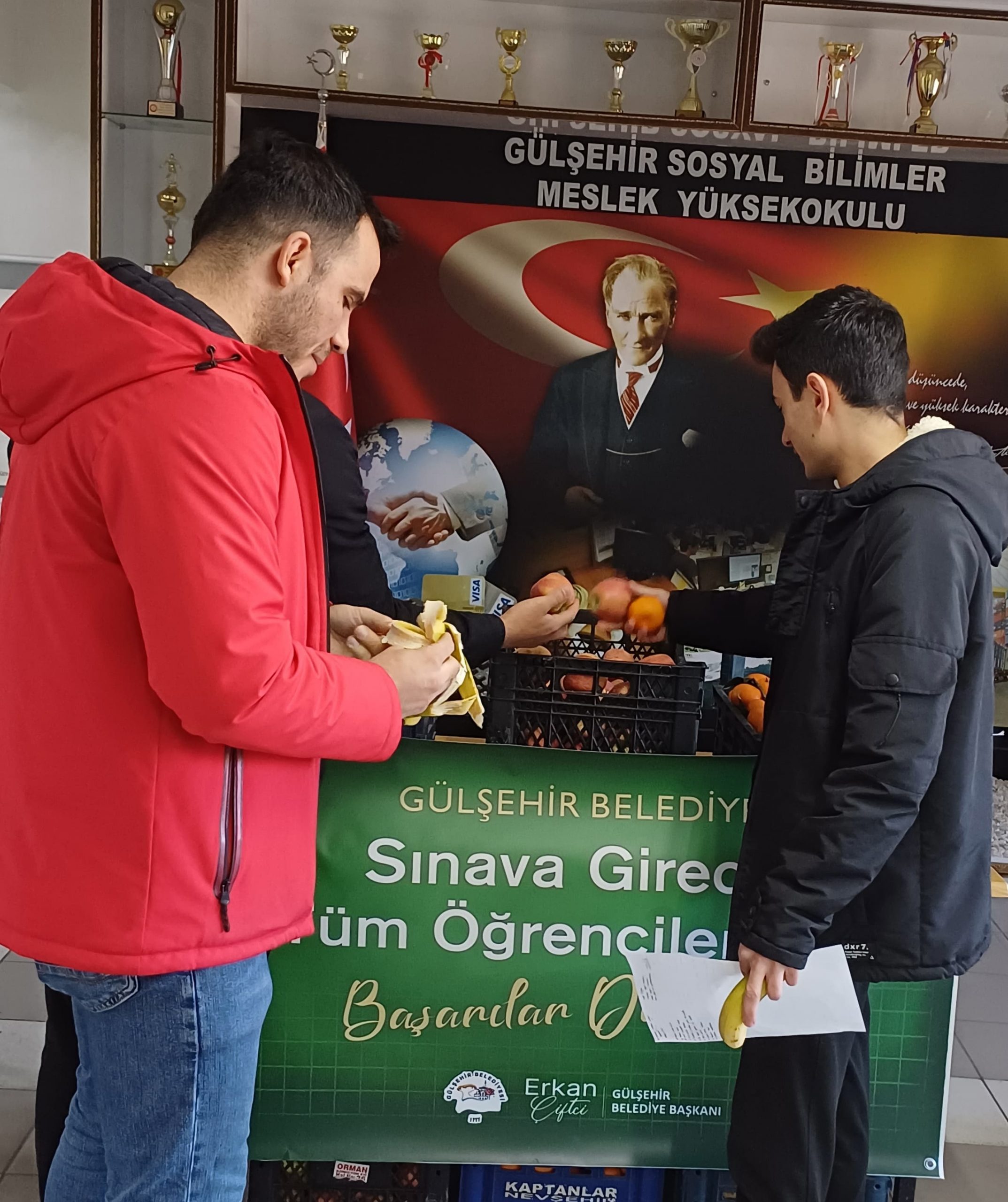 Nevşehir’in Gülşehir İlçe Belediyesi final sınavları haftası dolayısıyla Nevşehir Hacı Bektaş Veli Üniversitesi (NEVÜ) Gülşehir Sosyal Bilimler Meslek Yüksekokulu’nda eğitim gören öğrencilere moral ve motivasyon amaçlı meyve ikramında bulundu.