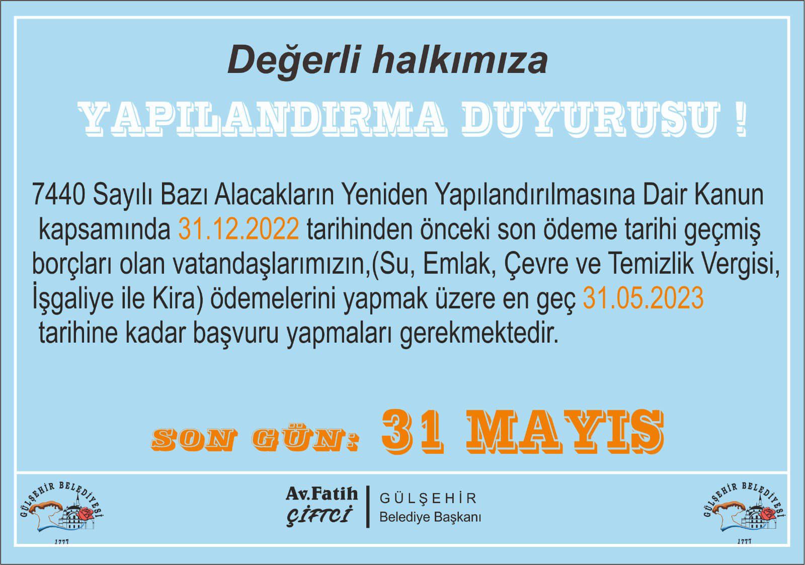 Açıklamada; “7440 Sayılı bazı alacakların yapılandırılması kanunu kapsamında 31 Aralık 2022 tarihinden önceki ödeme tarihi geçmiş belediyemize borçları bulunan vatandaşlarımızın( su, emlak vergisi, temizlik vergisi, işgaliye, kira vb) ödemelerini yapmak üzere en geç 31 Mayıs 2023 tarihine kadar yapmaları gerekmektedir. Bu durumda söz konusu kanun çerçevesinde yapılandırmadan yararlanabileceklerdir” denildi.