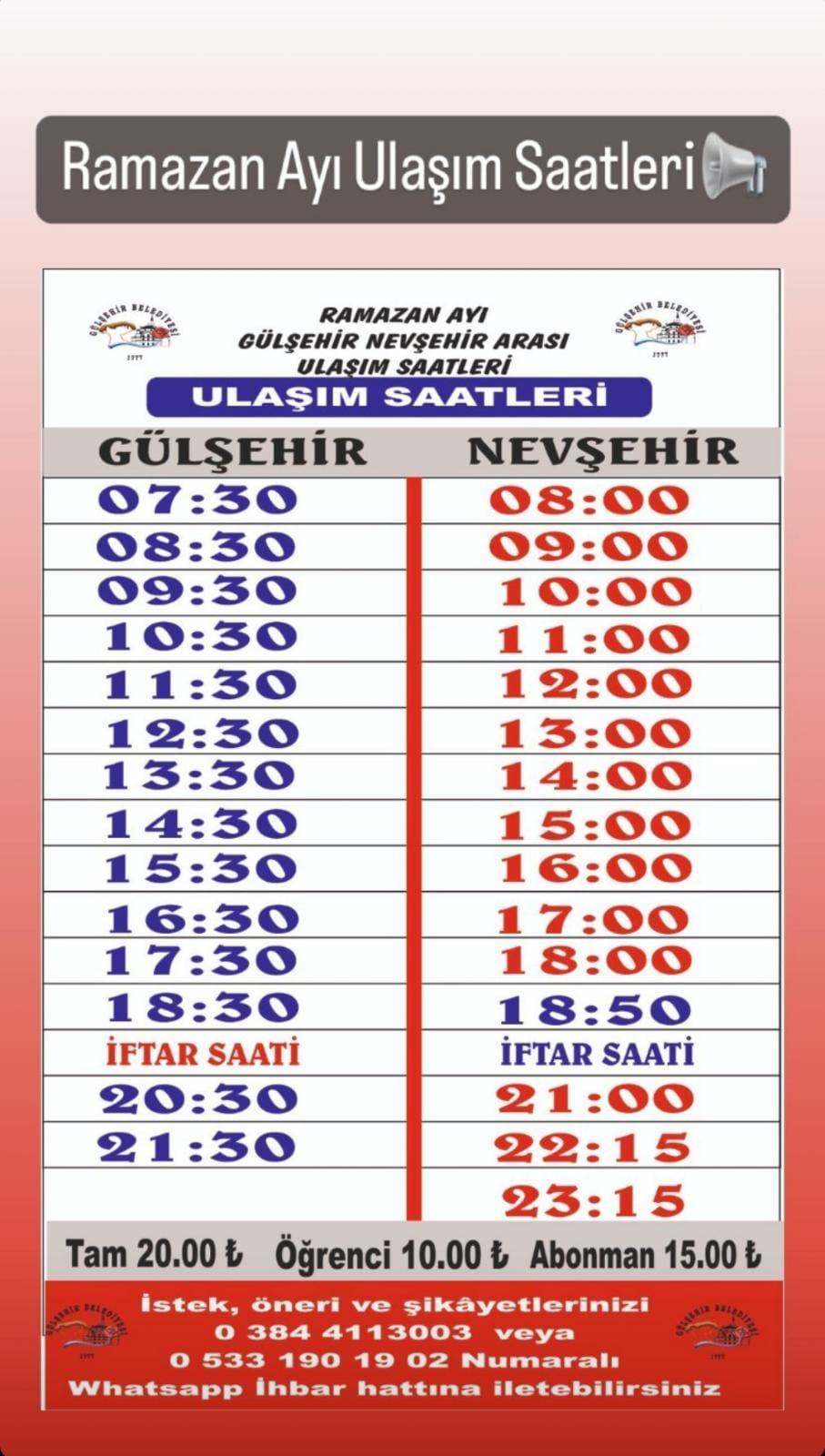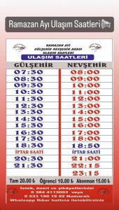 Yapılan yeni düzenlemeye göre Gülşehir’den Nevşehir’e otobüsler sabah 07.30’dan itibaren, birer saat arayla yolcu taşımaya başlayacak. Nevşehir’den Gülşehir’e ilk otobüs ise 08.00’da. İftar vakitlerinde otobüs seferlerine iki saat ara verilecek. Gülşehir en son otobüs 21.30’da, Nevşehir’den Gülşehir’e ise 23.30’da.