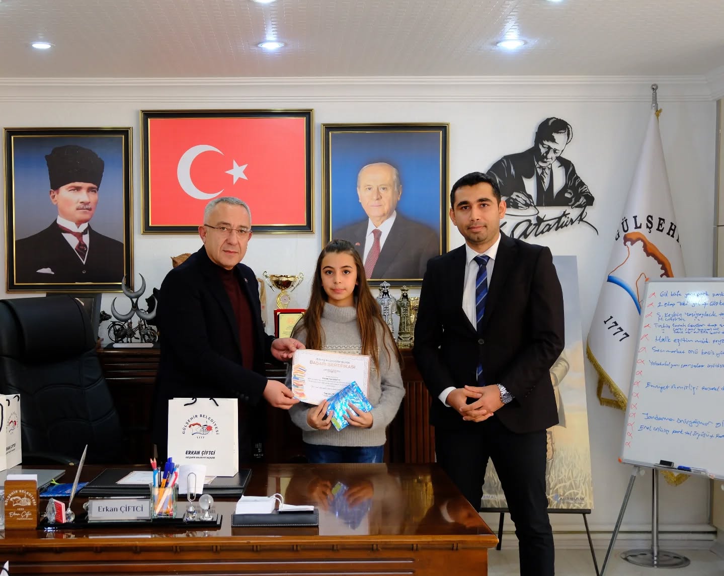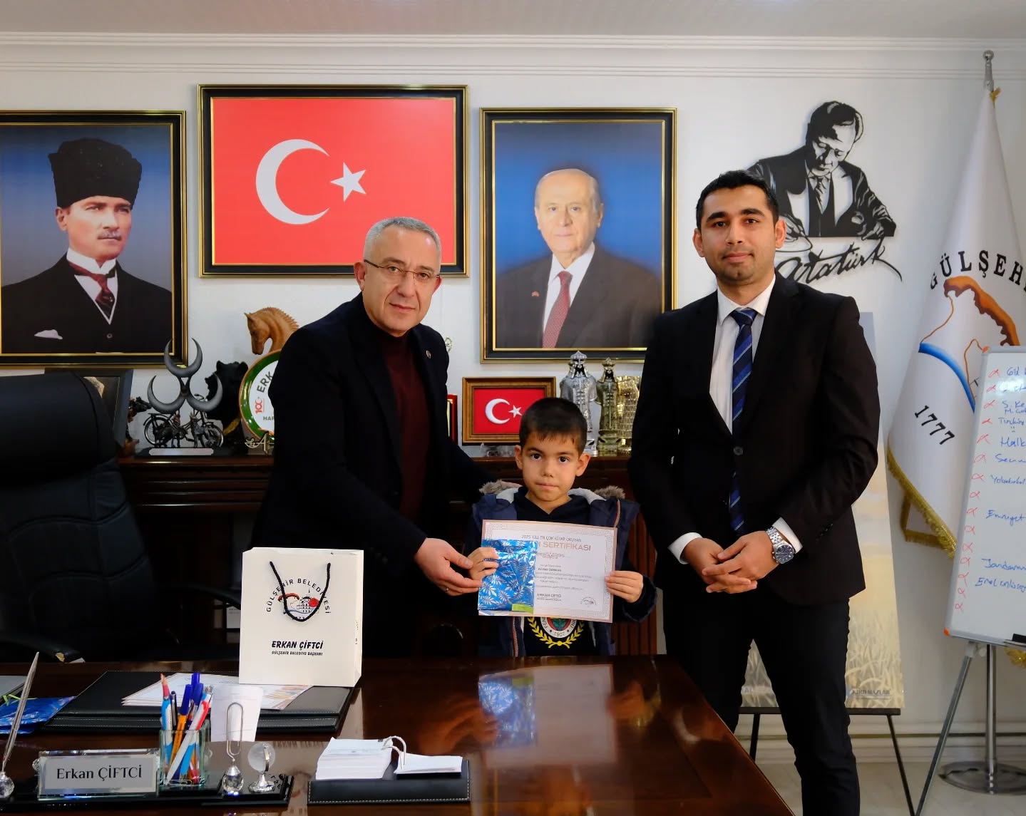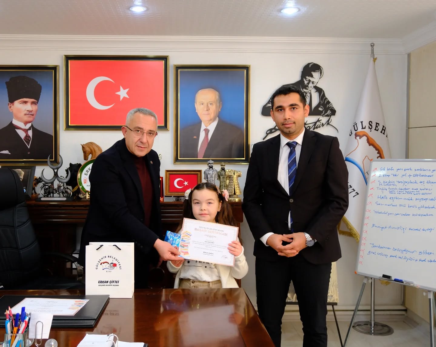 Gülşehir İlçe Halk Kütüphanesinde 2025 yılı boyunca en çok kitap okuyan öğrenciler, Gülşehir Belediye Başkanı Erkan Çiftci tarafından makamda ağırlandı. Başkan Çiftci, başarılı öğrencileri tek tek tebrik ederek çeşitli hediyeler takdim etti.