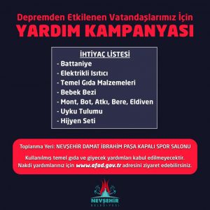 Kahramanmaraş’ta meydana gelen ve birçok ilde hissedilen 7.4 büyüklüğündeki depremin ardından Nevşehir’de, Nevşehir Valiliği ve Nevşehir Belediyesi tarafından yardım kampanyası başlatıldı. Bölgedeki depremzedelerin ihtiyaçlarını giderilmesine destek olmak için başlatılan kampanyada; battaniye, elektrikli ısıtıcı, temel gıda malzemeleri, bebek bezi, mont, bot, atkı, bere, eldiven, uyku tulumu,hijyen seti ve barınma malzemeleri içeren yardımlar, Damat İbrahim Paşa Kapalı Spor Salonu’nda toplanacak.