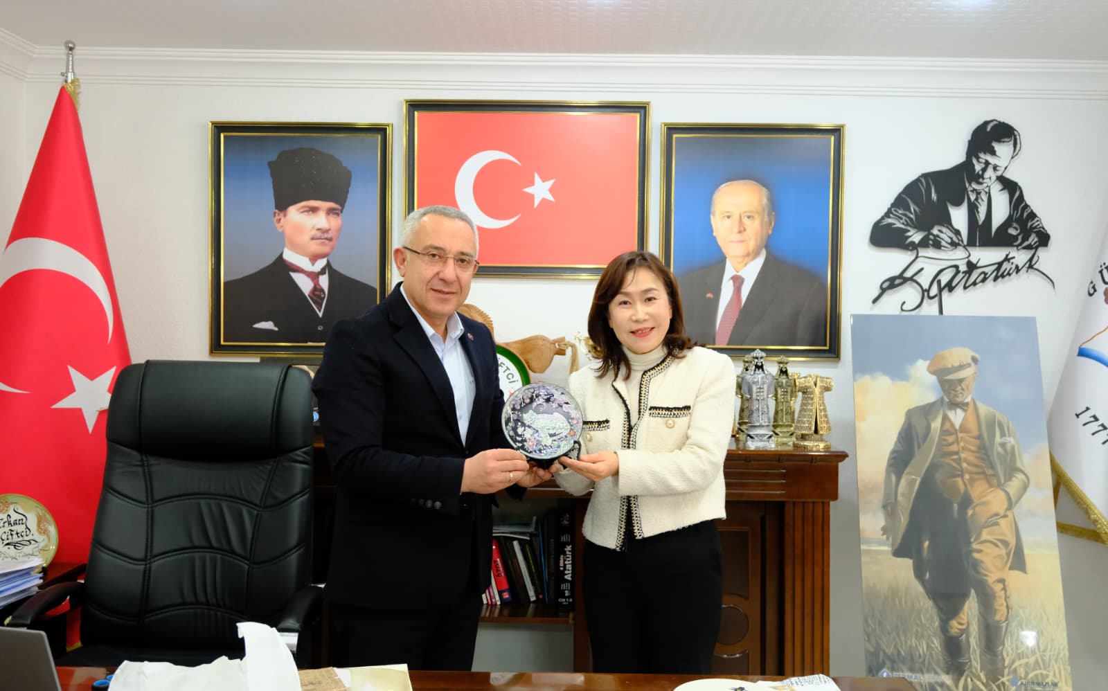 Gerçekleşen ziyarette, Güney Koreli heyet tarafından Başkan Çiftci’ye günün anısına hediye takdim edildi. Ziyaret sırasında, ilçeyi ziyaret eden misafirlerle Gülşehir’in tarihi ve kültürel değerleri üzerine samimi bir sohbet gerçekleştirildi.