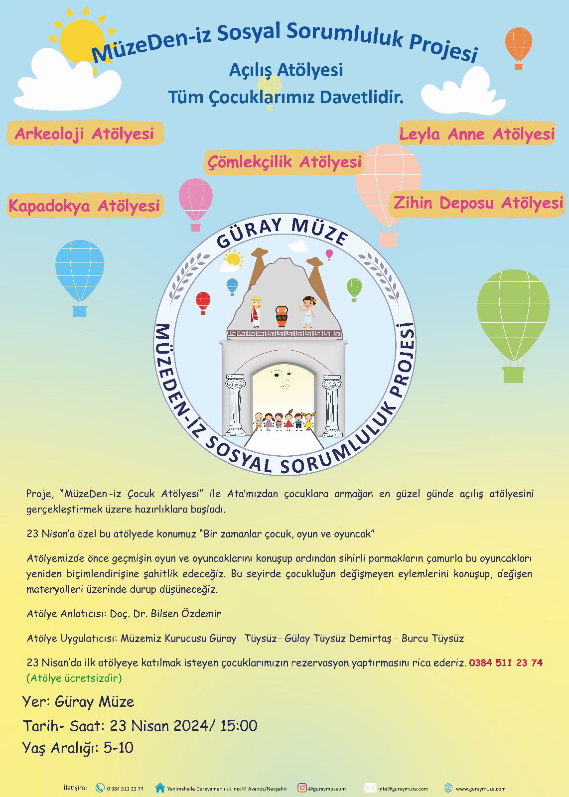 23 Nisan’da ilk atölyeye katılmak isteyen çocuklarımızın rezervasyon yaptırmasını rica ederiz. 0384 511 23 74 (Atölye ücretsizdir)