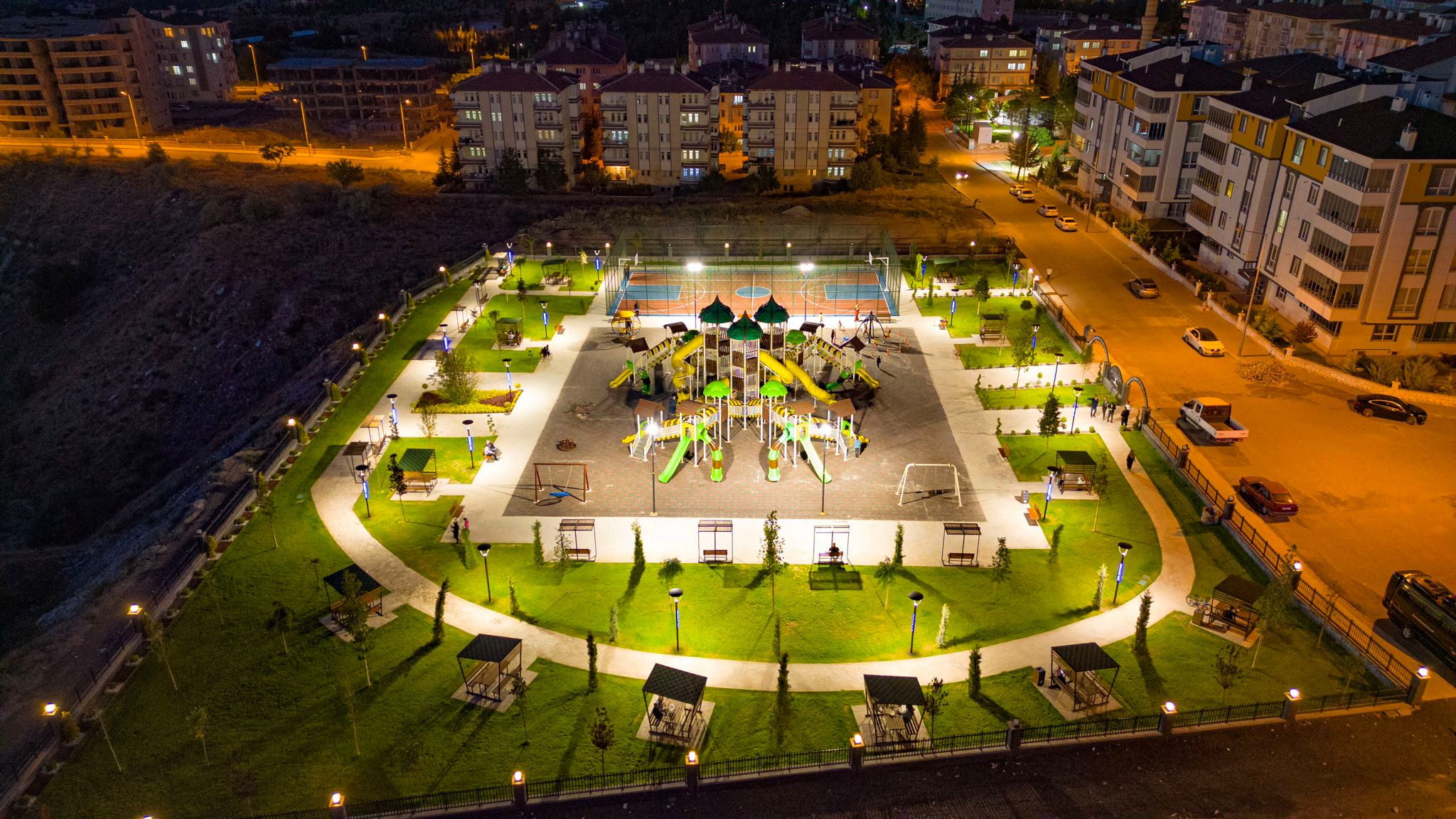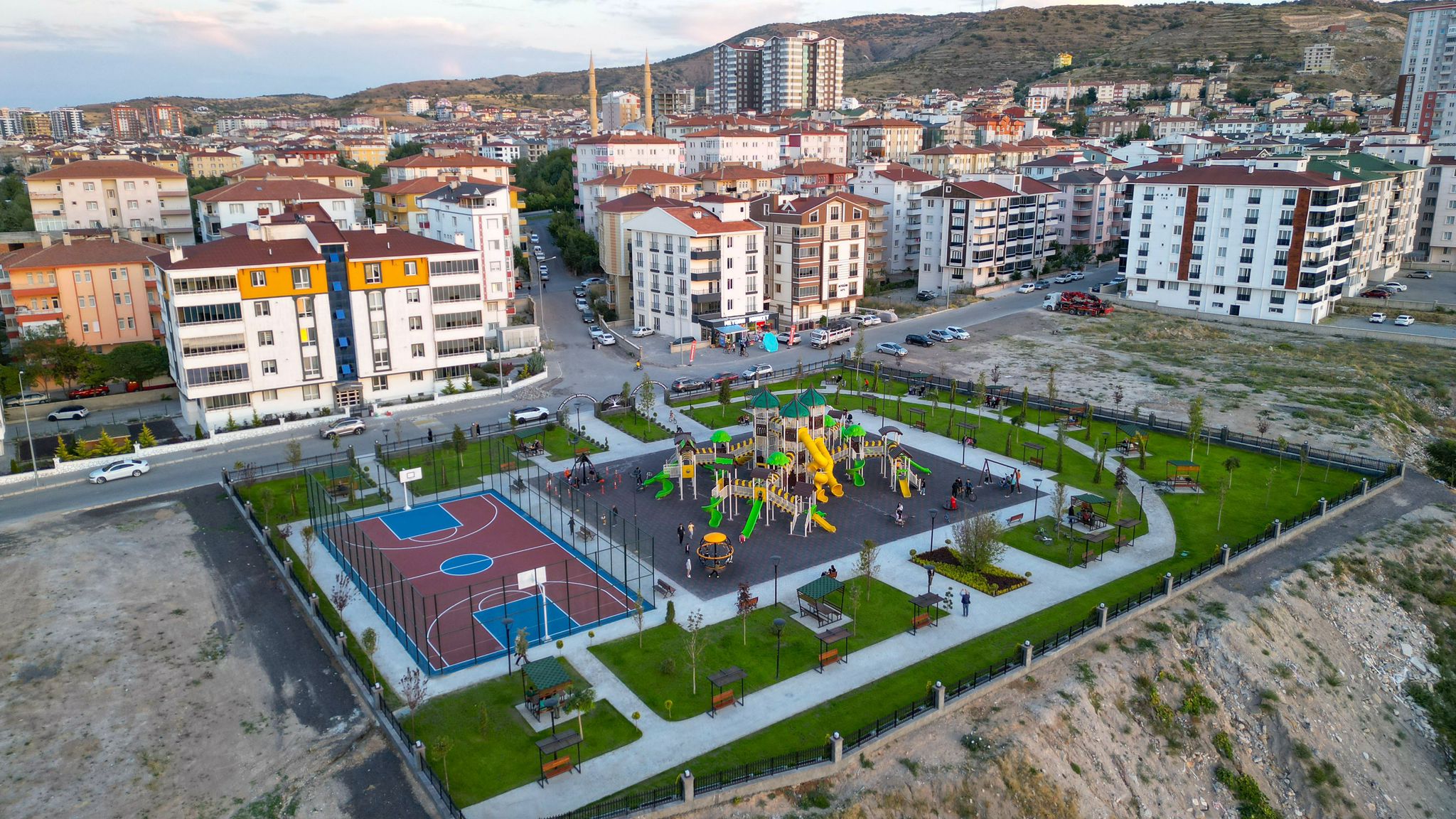 Yürüyüş yolu ile birlikte mahalle sakinlerinin aileleri ile vakit geçirebilmeleri için kent mobilyalarının da konulduğu parkta basketbol sahası da bulunuyor.