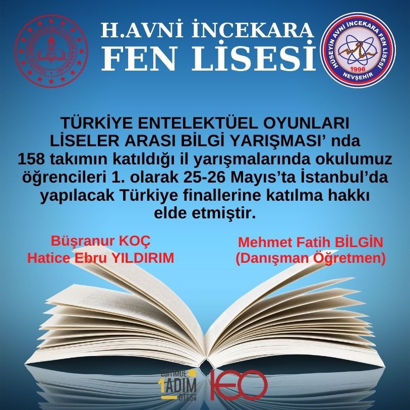 Ortaöğretim Genel Müdürlüğü koordinesinde 81 ilde ortaöğretim öğrencilerinin katılımıyla ve Nevşehir’de de 20 Nisan Cumartesi günü Yunus Emre İmam Hatip Ortaokulunda yapılan ”Türkiye Entelektüel Oyunları Yarışması”nda H. Avni İncekara Fen Lisesi takım halinde 1. oldu. Öğrenciler yarışmanın finali için İstanbul’a gidecek ve büyük ödülün sahibi olmaya çalışacak.