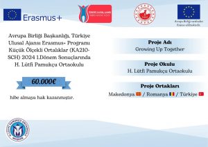 Erasmus+ Programı 2024 Teklif Çağrısı Küçük Ölçekli Ortaklıklar (KA210) ve İş Birliği Ortaklıkları (KA220) faaliyetleri kapsamında 1. başvuru döneminde sunulmuş projelerin değerlendirme sonuçlarına göre H. Lütfi Pamukçu Ortaokulunun projesi “Türkiye Ulusal Ajansı” tarafından hibe almaya uygun görüldü.