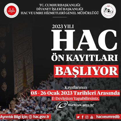 Hac ibadetini yapmak üzere 2023 yılında kutsal topraklara gitmek için ilk defa kayıt yaptıracaklar, müracaatlarını 05-26 Ocak 2023 tarihleri arasında e-Devlet üzerinden gerçekleştirebileceklerdir.