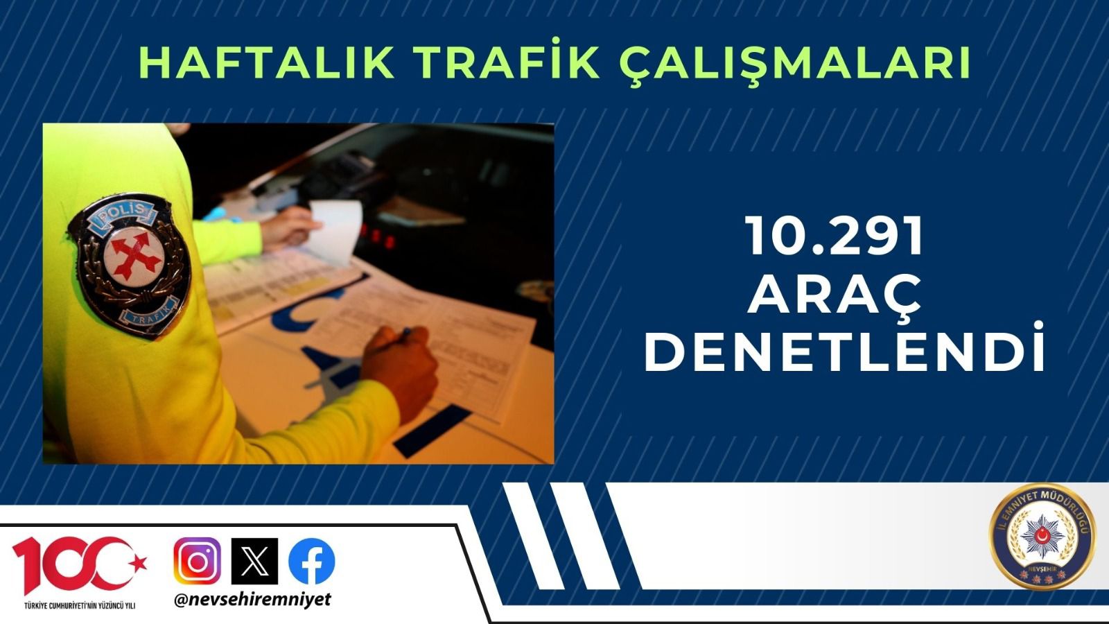 Son bir hafta içerisinde trafik birimlerimizce 10.291 araç sürücüsünün kontrolü yapılmış, 24 araç trafikten men edilmiş, hız ihlalinden 446, kırmızı ışık ihlalinden 145, hatalı parktan 31 ve diğer maddelerden 297 olmak üzere toplamda 919 araç/sürücüsüne cezai işlem uygulanmış; 25 yaralanmalı kazada 40 şahıs yaralanmıştır.