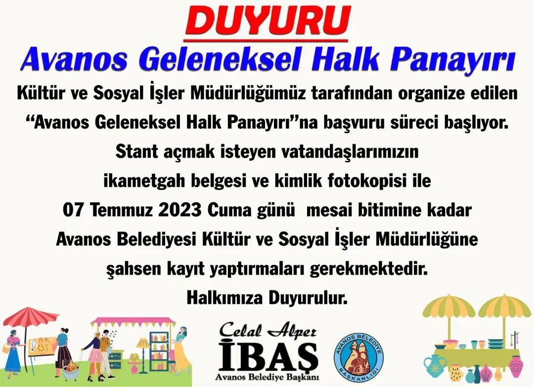 Avanos Belediyesi Kültür ve Sosyal İşler Müdürlüğü tarafından organize edilen “Avanos Geleneksel Halk Panayırı”na başvuru süreci başlıyor.