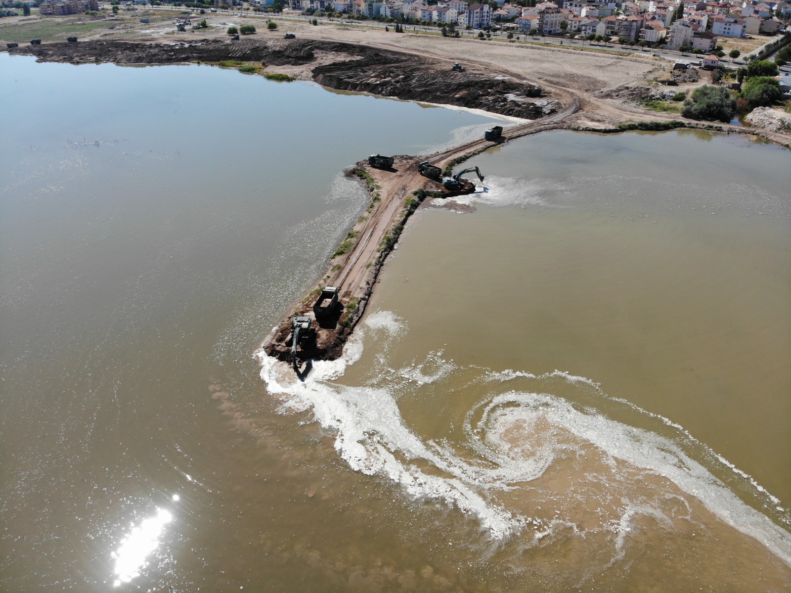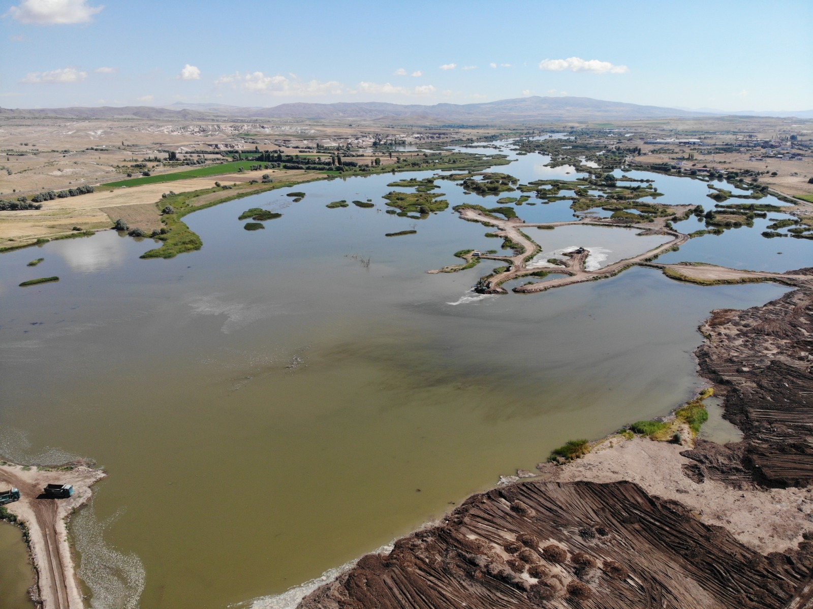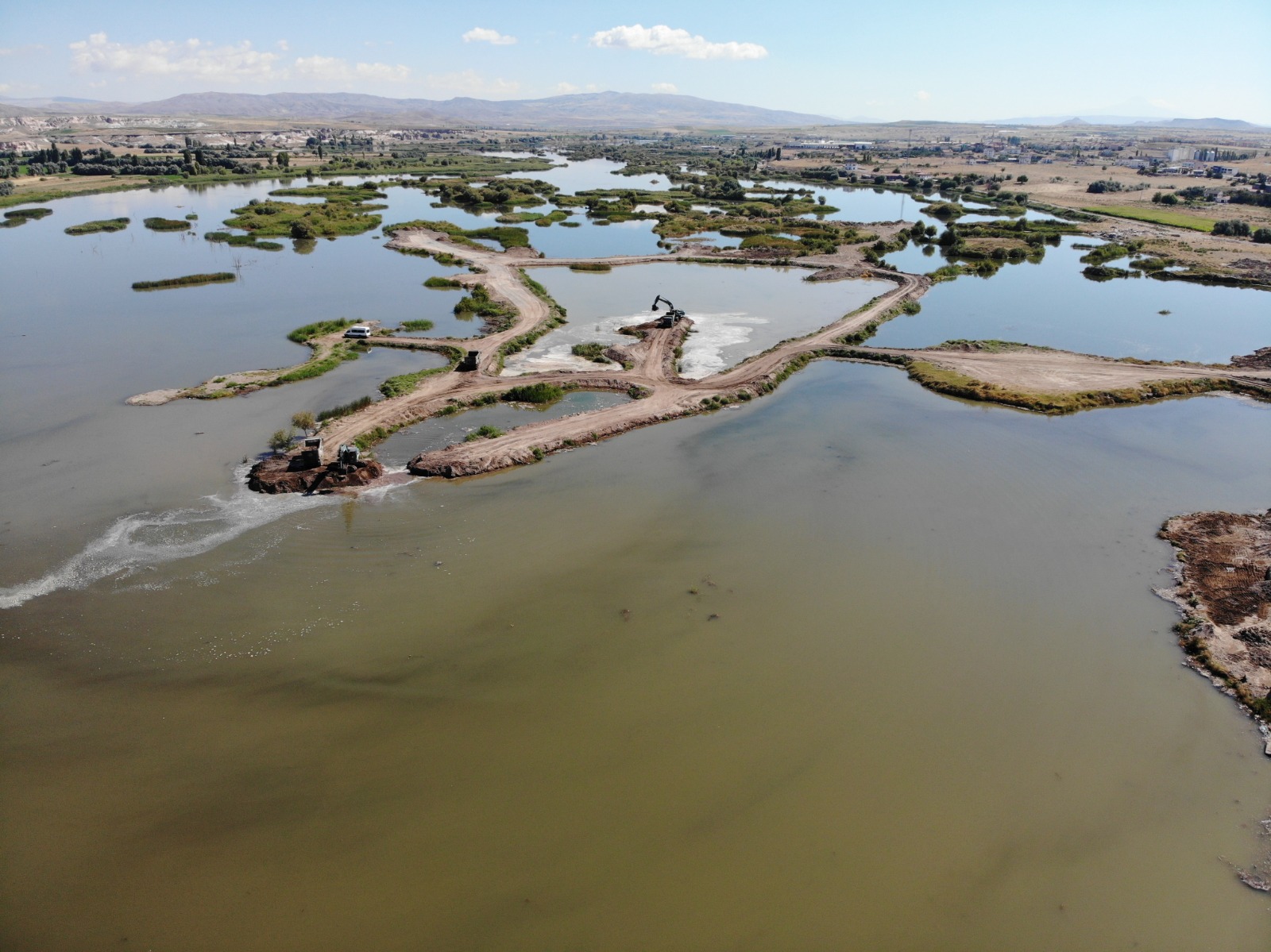 Gülşehir ilçesinde yapımı devam eden Millet Bahçesi için ilk olarak DSİ 12. Bölge Müdürlüğü Kızılırmak içerisinde bulunan adacıkları temizleniyor. Geçmiş yıllarda bölgede faaliyet gösteren kum ocaklarının Kızılırmak üzerinde düzensiz çalışmaları nedeniyle onlarca adacık oluştu. Oluşan bu adacıklar hem suyun düzensiz akışına neden olurken hem de kötü görüntüye neden oldu. Kayseri DSİ 12. Bölge Müdürlüğü tarafından yürütülen çalışmalarda Kızılırmak nehri içerisinde bulunan adacıkların temizlenebilmesi için önce kıyıdan adacıklara yol yapılıyor. Daha sonra acık ve yapılan yol tekrar temizleniyor. Yapılan çalışmalar hakkında bilgi veren DSİ 12. Bölge Müdürlüğünde görevli Şantiye Şefi Erdoğan Akgüneş, “DSİ 12. Bölge Müdürlüğü olarak Nevşehir’in Gülşehir ilçesinden geçen Kızılırmak içindeki adacıkları temizliyoruz. Bu temizliği yapabilmemiz için önce adacıklara yol yapıyoruz. Daha sonra hem adacığı, hem de yolu temizliyoruz. Çıkarttığımız hafriyatı da hemen kıyıya dökerek dolgu yapıyoruz. Yaptığımız bu çalışma ile aynı zamanda ırmağın akışını da vermiş oluyoruz” şeklinde konuştu.