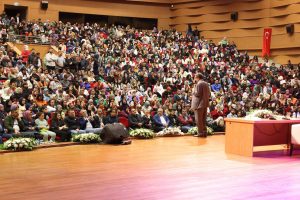 Nevşehir Hacı Bektaş Veli Üniversitesi Damat İbrahim Paşa Salonu’nda düzenlenen ‘Hayata Şiirden Bakmak’ adlı söyleşi programına üniversite öğrencilerinin yanı sıra her yaştan vatandaş yoğun ilgi gösterdi. Solonun hınca hınç dolduğu söyleşiyi Nevşehir Belediye Başkanı Dr. Mehmet Savran’da takip etti.