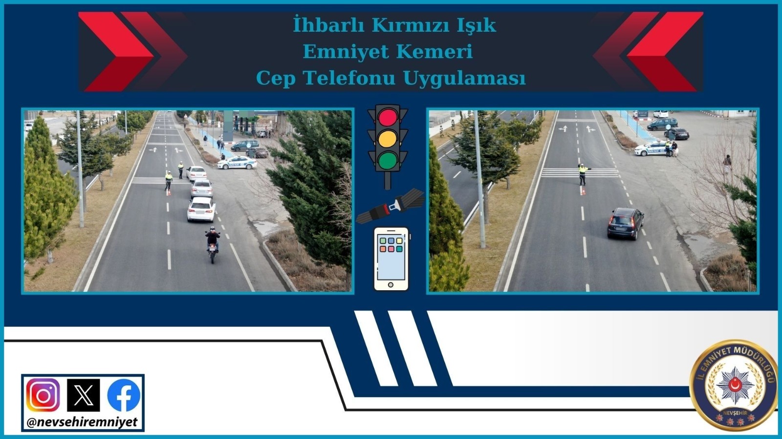İhbarlı kırmızı ışık- emniyet kemeri- cep telefonu uygulaması gerçekleştirildi. Trafik birimlerince vatandaşların güvenli bir şekilde seyahat edebilmeleri için araç yoğunluğunun olduğu güzergâhlarda “İhbarlı Emniyet Kemeri – Kırmızı Işık – Cep Telefonu Denetimi” gerçekleştirilmiş, yapılan denetimlerde 2 sürücüye belgesiz araç kullanmaktan, 4 sürücüye seyir halinde cep telefonu kullanmaktan, 14 sürücüye kırmızı ışık ihlalinden ve 2 araca da diğer maddelerden olmak üzere kurar ihlali yapan 22 araç ve sürücüsüne cezai işlem uygulandı.