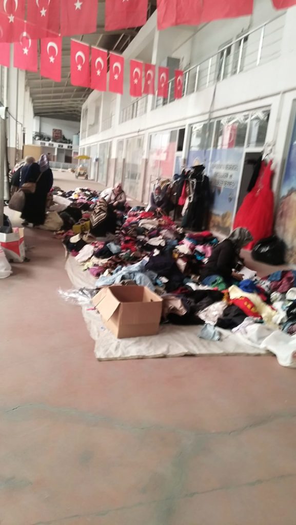 Pazaryeri içerisindeki dernek binasının önünde kurulan ve çoğu sıfır, kullanılmamış ürünlerden oluşan kıyafetler ihtiyaç sahiplerine dağıtılıyor.