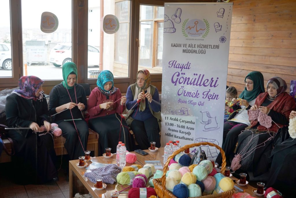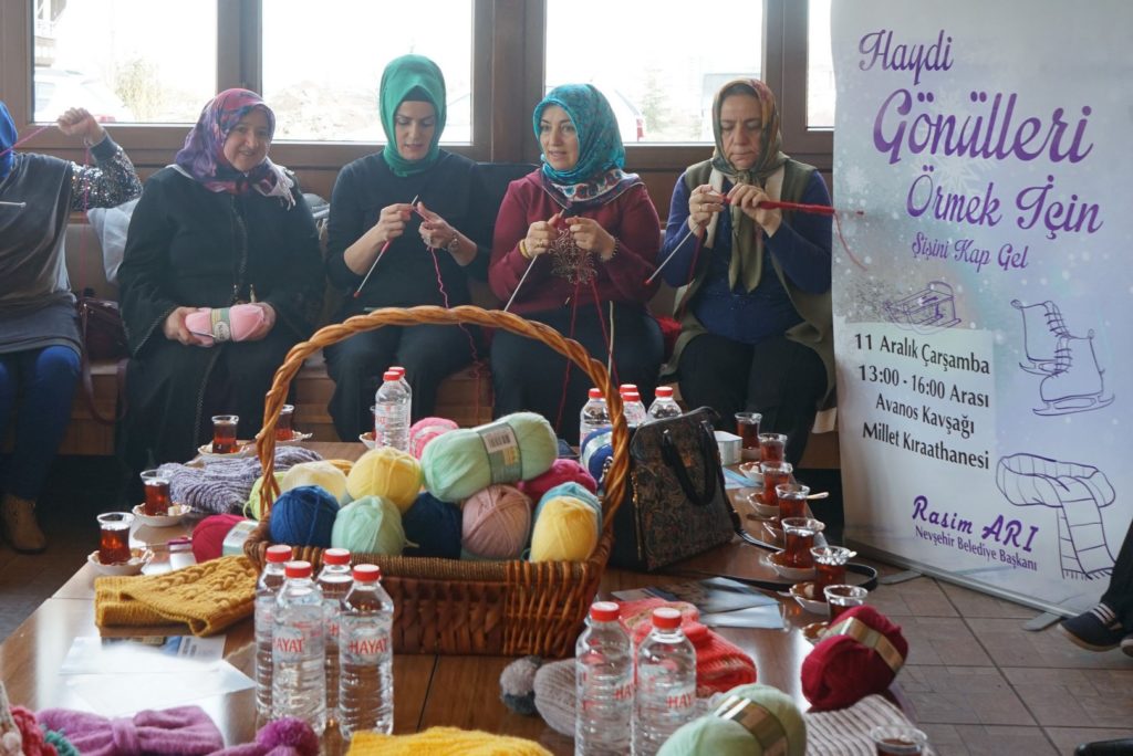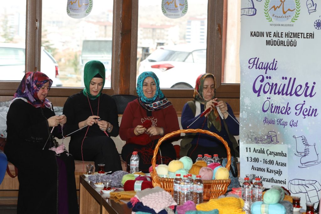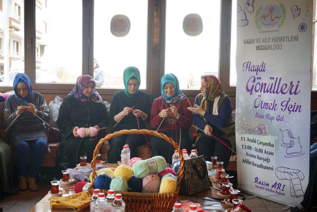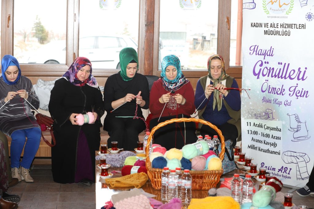 Belediye Başkanı Rasim Arı’nın eşi Melek Arı’nın öncülüğünde Nevşehir Belediyesi Kadın ve Aile Hizmetleri Müdürlüğü tarafından hazırlanan proje kapsamında Melek Arı ve gönüllü kadınlar, Nevşehir’deki çeşitli okullardaki ihtiyaç sahibi öğrencilerin soğuk havalarda üşümemesi için onlara atkı ve bere örmek üzere bir araya geldi.