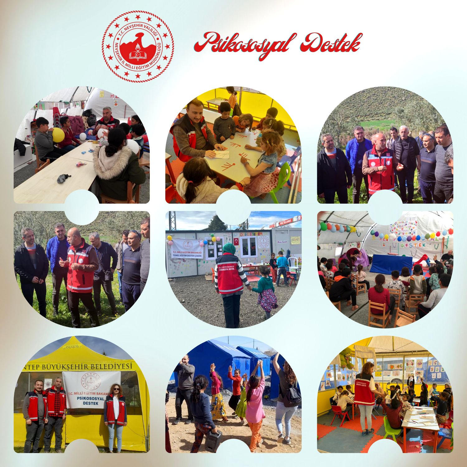 Bu kapsamda Nevşehir İl Millî Eğitim müdürü ve görevli öğretmenler tarafından deprem bölgelerinde kurulan psikososyal destek çadırlarında ve DYK noktalarında çocukların eğitim öğretim faaliyetlerine devam etmeleri ve çeşitli etkinlikler düzenleyerek güzel vakit geçirmeleri sağlanıyor.