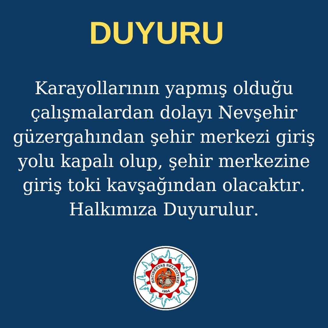 Hacıbektaş ilçesinde Karayollarının Çevreyolu’nda yapmış olduğu Asfaltlama çalışmalardan dolayı Nevşehir güzergahından şehir merkezi giriş yolu 15 gün süreyle kapalı olup şehir merkezine giriş ve çıkışlar TOKİ kavşağından olacak.