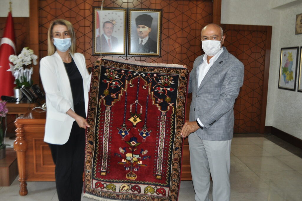 Başkan Özdemir ziyaretin anısına Vali Becel’e halı hediye etti.