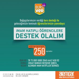 Dernek Başkanı Mehmet Kahraman, “Bağışçılarımızın verdiği burs desteği ile geleceğimizin teminatı öğrencilerimizin yanındayız. Ayda 250TL veya katları şeklinde vereceğiniz bursları İmam Hatip Lisesi öğrencilerine her ay ulaştırarak onların eğitim hayatını kolaylaştırıyoruz.