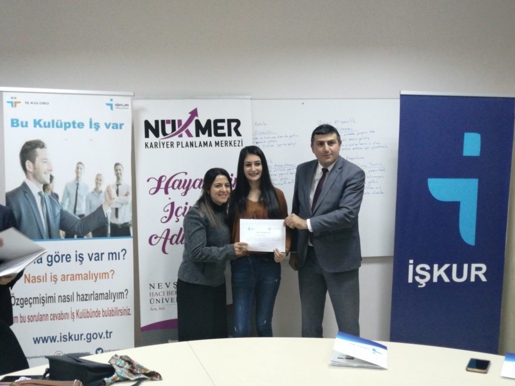 NEVÜ İktisadi ve İdari Bilimler Fakültesi ile Turizm Fakültesi öğrencilerine dört gün süren eğitim sonunda, Nevşehir Çalışma ve İş Kurumu İl Müdürü Arif Sıddık Barata ve NEVÜ Kariyer Merkezi (NÜKMER) Müdürü Dr. Öğretim Üyesi Emine Zehra Turan tarafından belgeleri verildi.