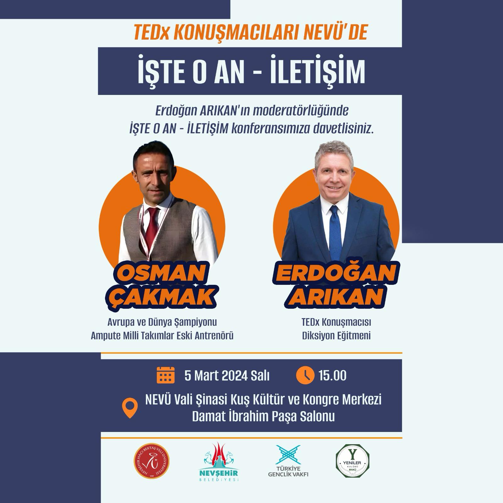 Avrupa ve Dünya Şampiyonu eski Ampute Milli Takım Antrenörü Osman Çakmak ve Diksiyon Eğitmeni ve Tedx konuşmacısı Erdoğan Arıkan’ın katılımıyla Nevşehir’de “İşte O An / İletişim” temalı konferans düzenlenecek.