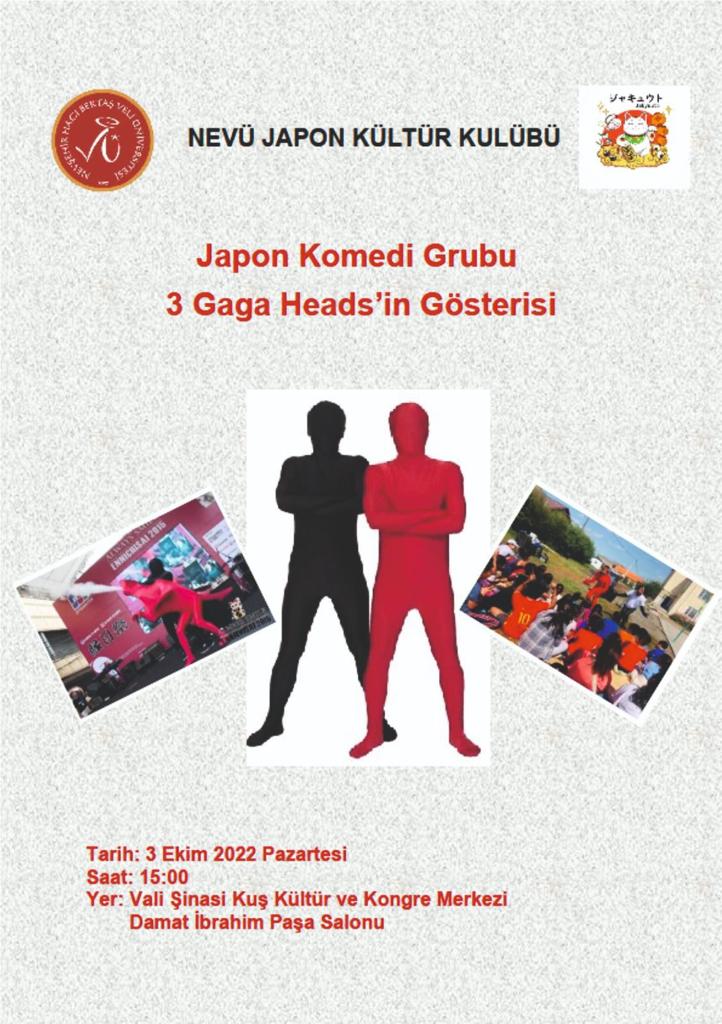 2005 yılında Japonya’da kurulan ve dünya çapında 33 ülkeyi gezen, komedi performans grubu 3 Gaga Heads, Nevşehir Hacı Bektaş Veli Üniversitesi (NEVÜ)’ye geliyor.