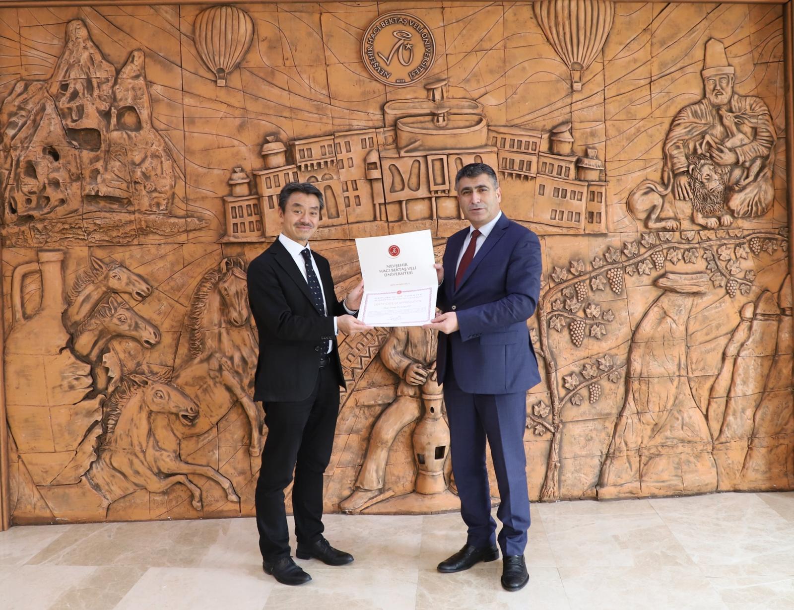 Japonya’nın Osaka Üniversitesi’nde kariyerine devam edecek olan Fujimoto’ya mesleki ve akademik hayatında başarılarının devam etmesini dileyen Rektör Prof. Dr. Semih Aktekin, uluslararası iş birliklerinin akademik gelişim için önemli olduğunu vurgulayarak iki üniversite arasında kurulacak ikili iş birliklerini desteklemeye devam edeceklerini ifade etti. Aktekin ayrıca NEVÜ’ye sağladığı değerli katkılarından dolayı Fujimoto’ya teşekkür ederek kendilerine plaket ve teşekkür belgesi takdim etti.