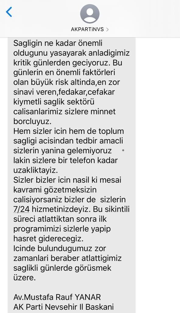 AK Parti Nevşehir İl Başkanı Yanar; “Bu arada, “Canın, Benim Canım” diyerek çalışan emektar sağlıkçılarımız ,Bizler Evlerimizdeyiz, sizler bizler için canla başla mücadele ederken bizler sizler için 14 gün kuralına uyup zorunlu olmadıkça çıkmıyoruz ve de evlerimizdeyiz.