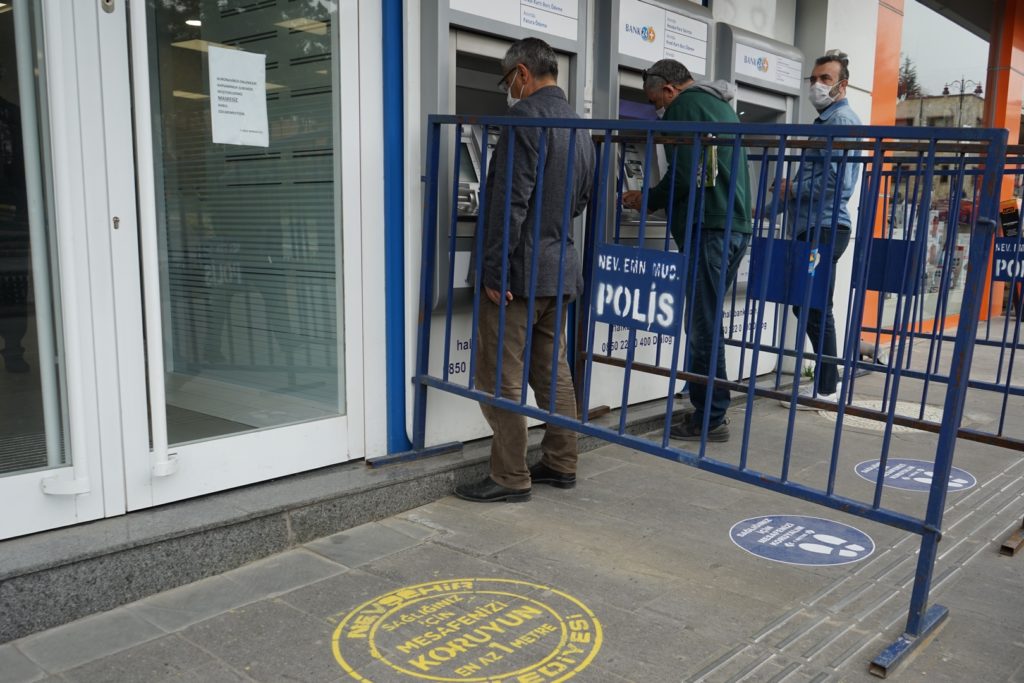 Yapılan uygulama sonrasında banka ve ATM önlerinde sıra bekleyen vatandaşların boya ile yazılan alanlarda beklediği ve sosyal mesafe kurallarına uyduğu görüldü.