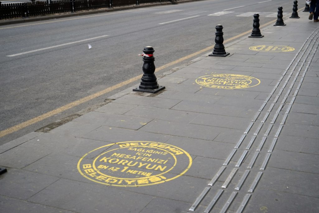 Nevşehir Belediyesi Destek Hizmetleri Müdürlüğü’ne bağlı ekipler, Başkan Rasim Arı’nın talimatıyla vatandaşların ortak ve yoğun olarak kullanmak zorunda kaldığı alanlarda sosyal mesafe uyarısı yaptı.